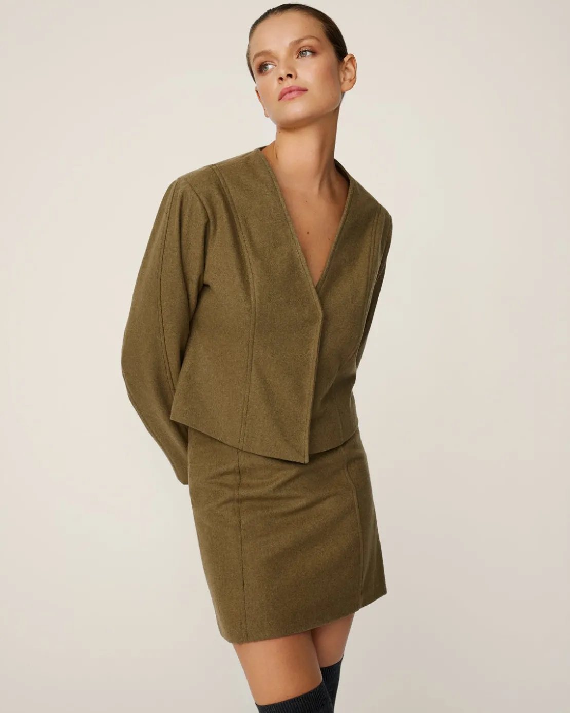 This limited collection wool jacket is a fusion of timeless elegance and modern feminism. This jacket boasts a tailored fit with a short length, offering casual comfort. The unique cutline details add exclusivity to this attire, creating a flattering look. Crafted from a high-quality recycled wool blend, Isabelle jacket provides a luxurious feel against your skin and warmth for the colder days. Whether you are wearing it as a standalone piece along with mathching skirt for a complete look, or as a layering piece with a basic top and blue-washed jeans, it is an ideal piece that creates a versatile and chic silhouette.