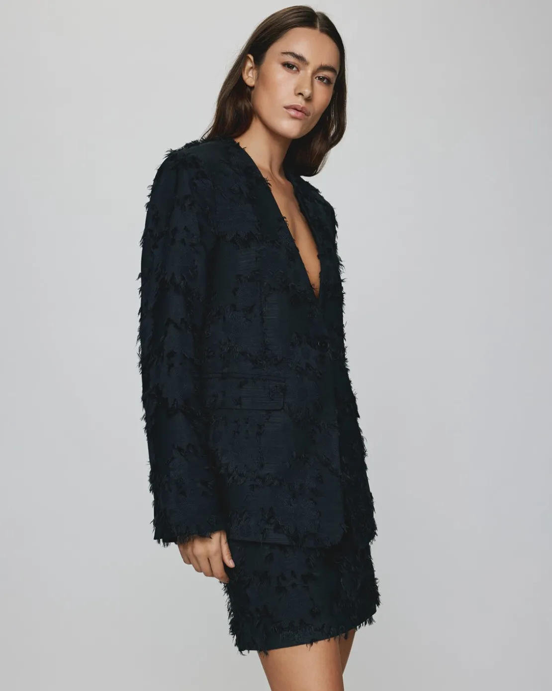 A bold, modern take on a classic black blazer with is texture. The blazer features a stright fit with a single button closure and 2 front pockets. Style it with the matching mini skirt for a full sleek look.
