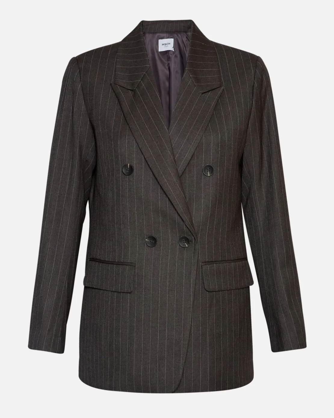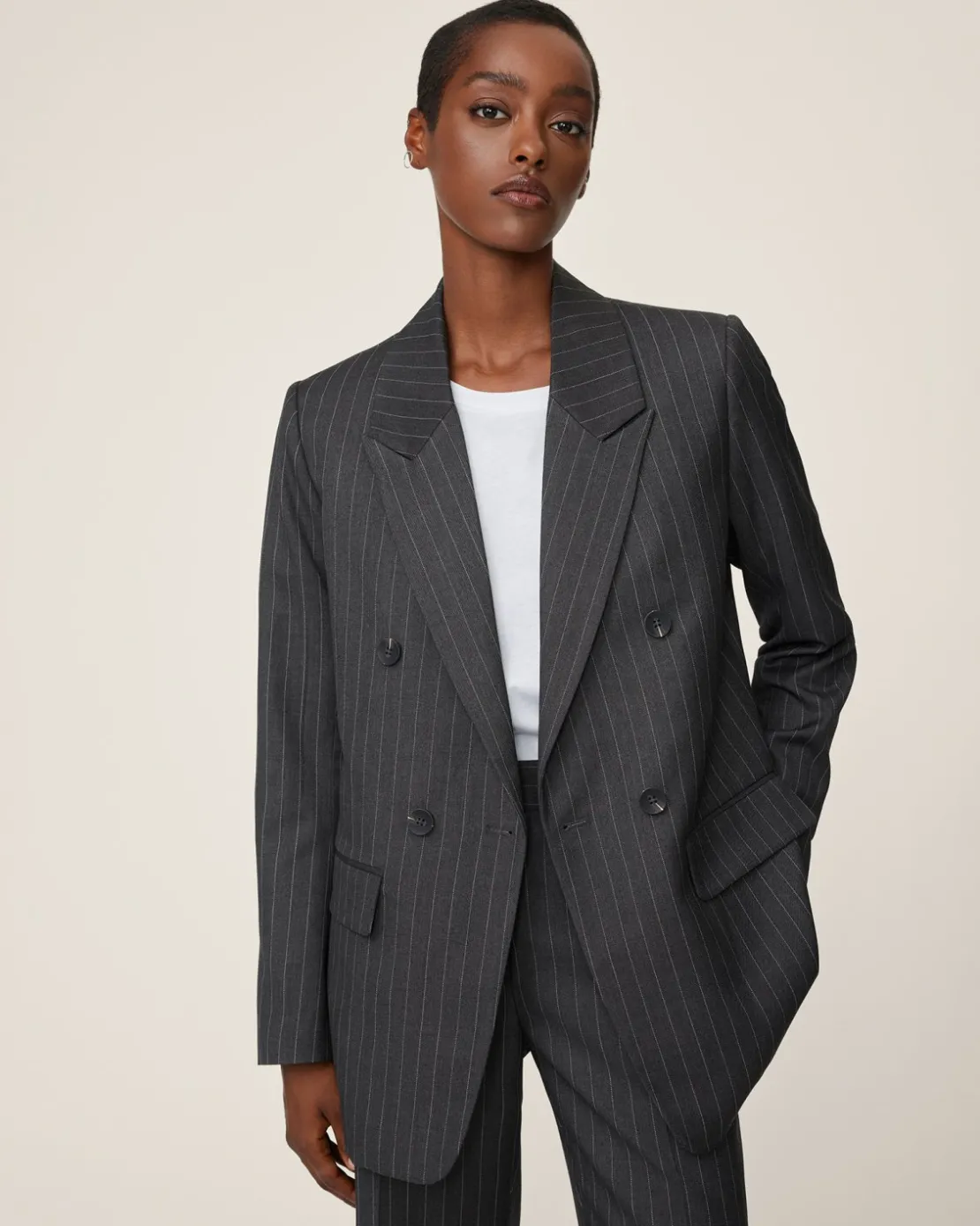 Marelda is a tailored blazer, perfectly combining sophisticated and chic elegance in a contemporary fashion. It features a double-breasted design, front pockets and a loose fitting, creating a tasteful contrast to the classical white stripes which are the statement features for any elegant tailored piece. The design is the perfect reflection of the minimalistic and Scandinavian style, while offering comfort and durability, ensuring it remains a staple piece in your wardrobe for years. Style with matching tailored pants and a white tee for any formal outings.