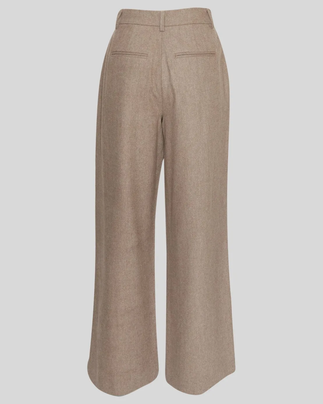 A pair of perfect suit pants for winter. These pants feature a warm brown colour and is made in a wool blend material to add extra warmt to your legs during these cold months. The design is a high waisted, wide legged pant with pleats, pockets and zipper/button closure.