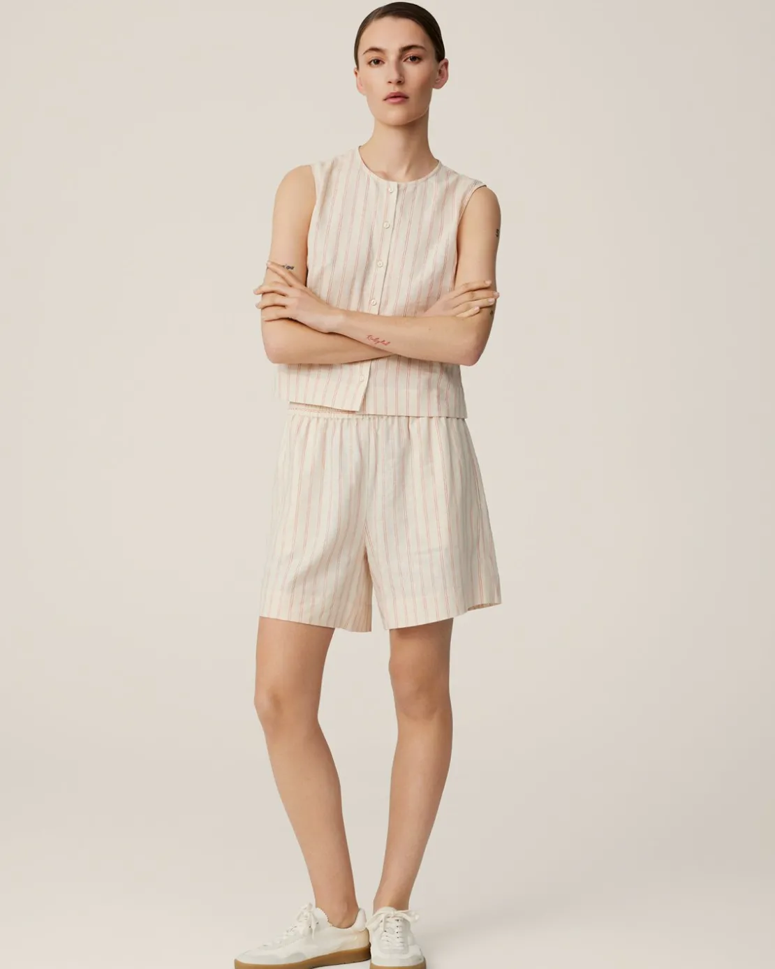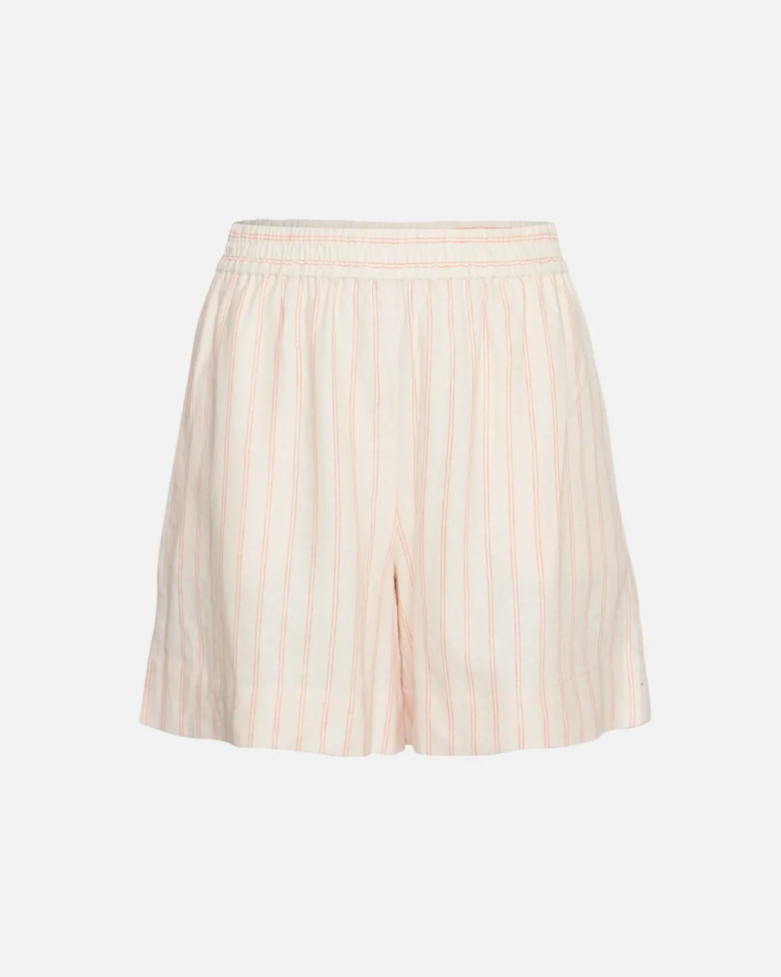 The linen obsession continues with our new Conella series. You’ll find a strap dress, a top, a pair of pants and these shorts. They all have the subtle orange stripes on a beige linen background. The shorts feature an elastic waist and above the knee length. It’s easily matched with different colours and silhouettes if you want to opt for something different than the matching set.