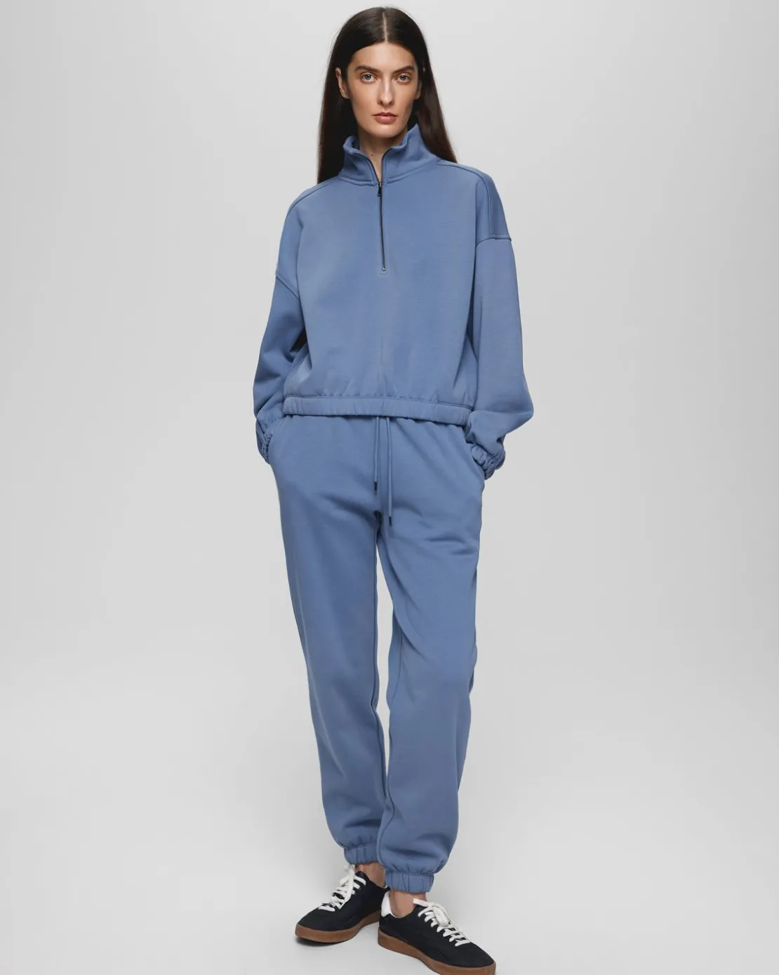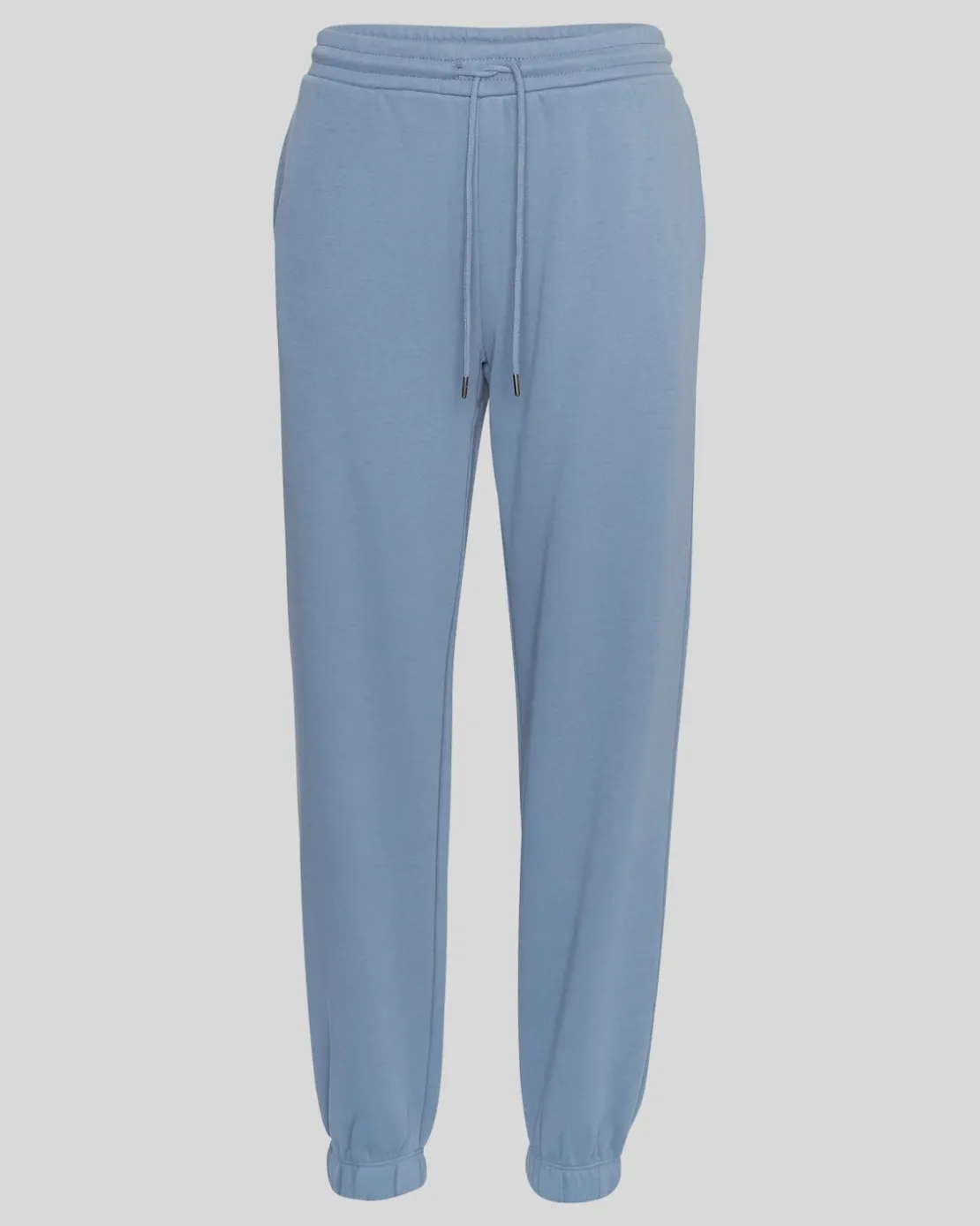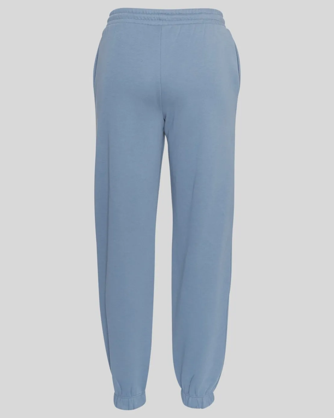 A pair of classic sweatpants with elastic waist with tie strings and elastic cuffs. They feature side pockets. The material is in the thicker quality and still ultra soft. Lift up your loungewear with this stunning blue set.