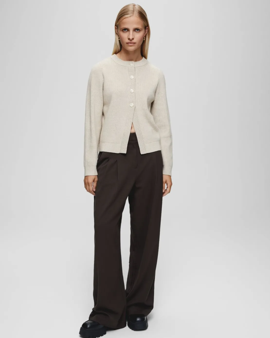 These pants have a wide-leg fit. The model is 176cm and wears a size S.
