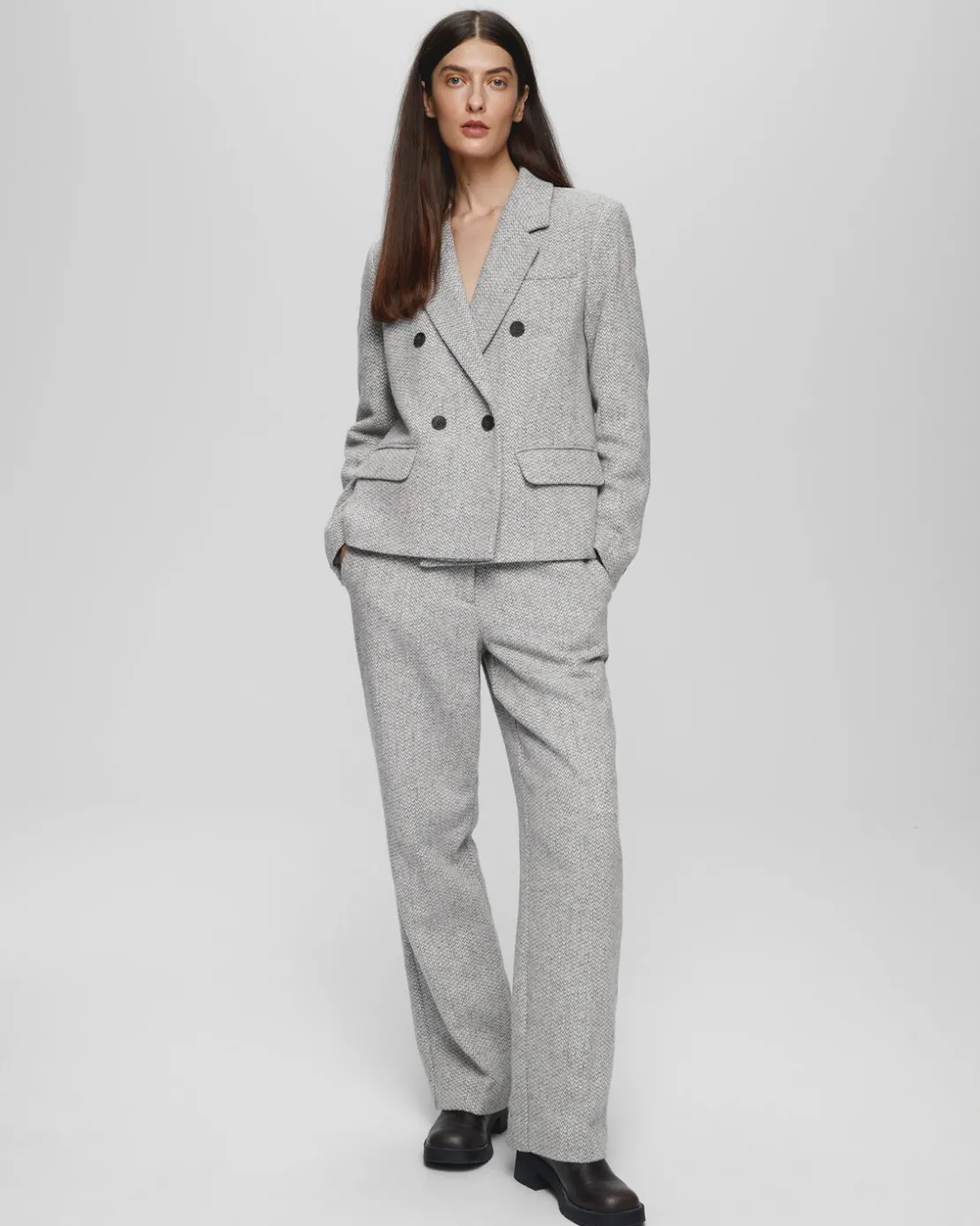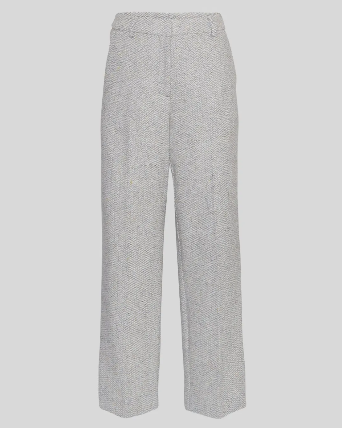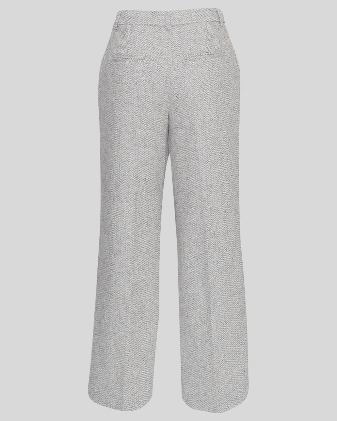Our Herena pants, is a classic straight cut suit pant given a new life through this quiltet design.The colour is light, warm grey and the thread has a colouring detail consisting of small rose and yellow spots that gives the genereal colour life. Zoom in on the picture to see the details. The pants has a straight fit, zipper and button closure and belt straps. There is a matching blazer to complete the set.