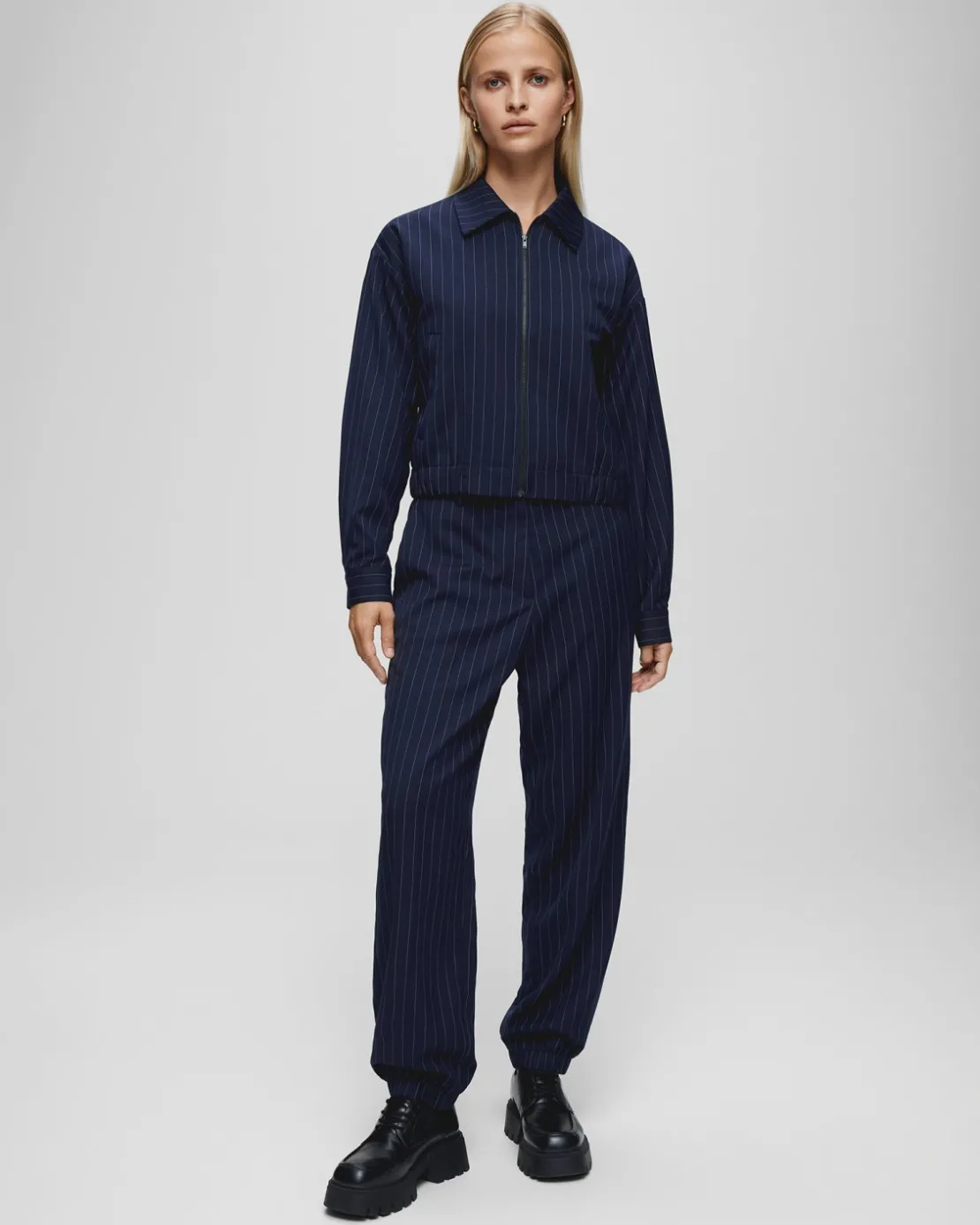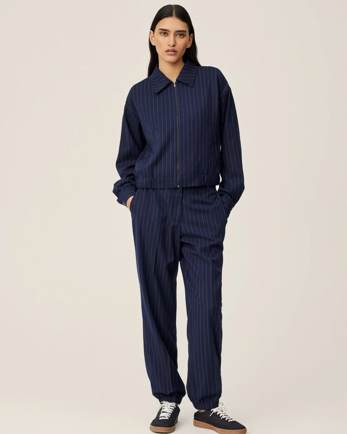 Marelda is a sporty co-ord set consisting of these pants and a bomber jacket. The pants feature a semi high waisted fit, with both an elastic band around the waist and the ankles to enhance the sporty look of this set. There’s side pocket in the pants.