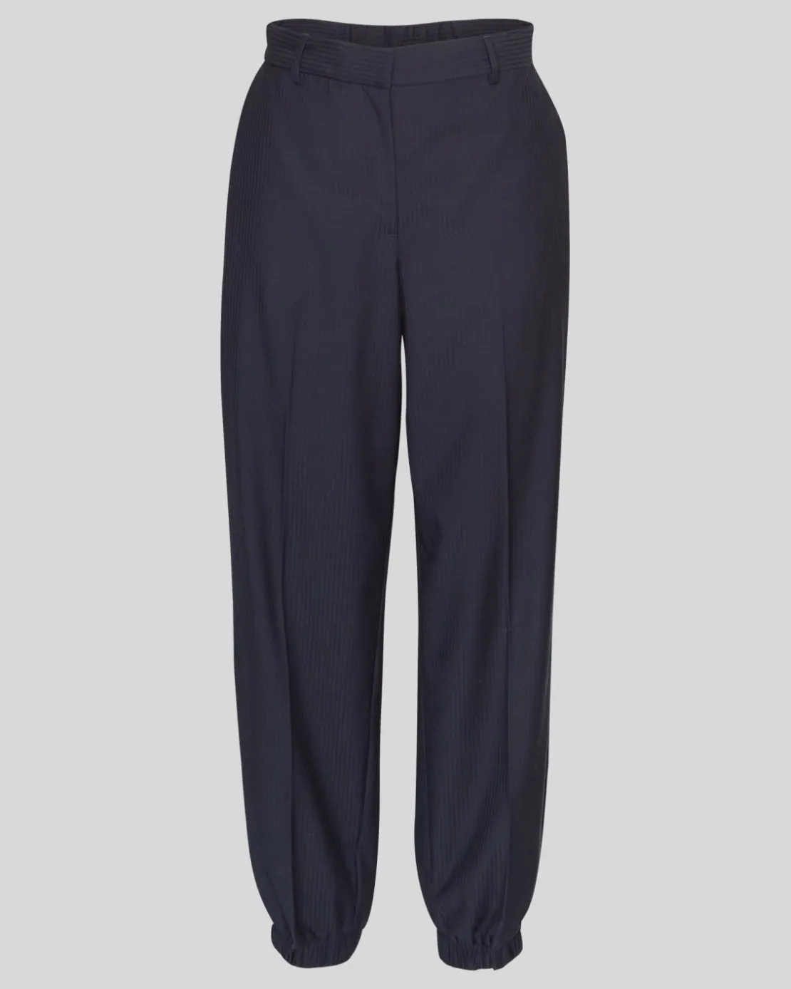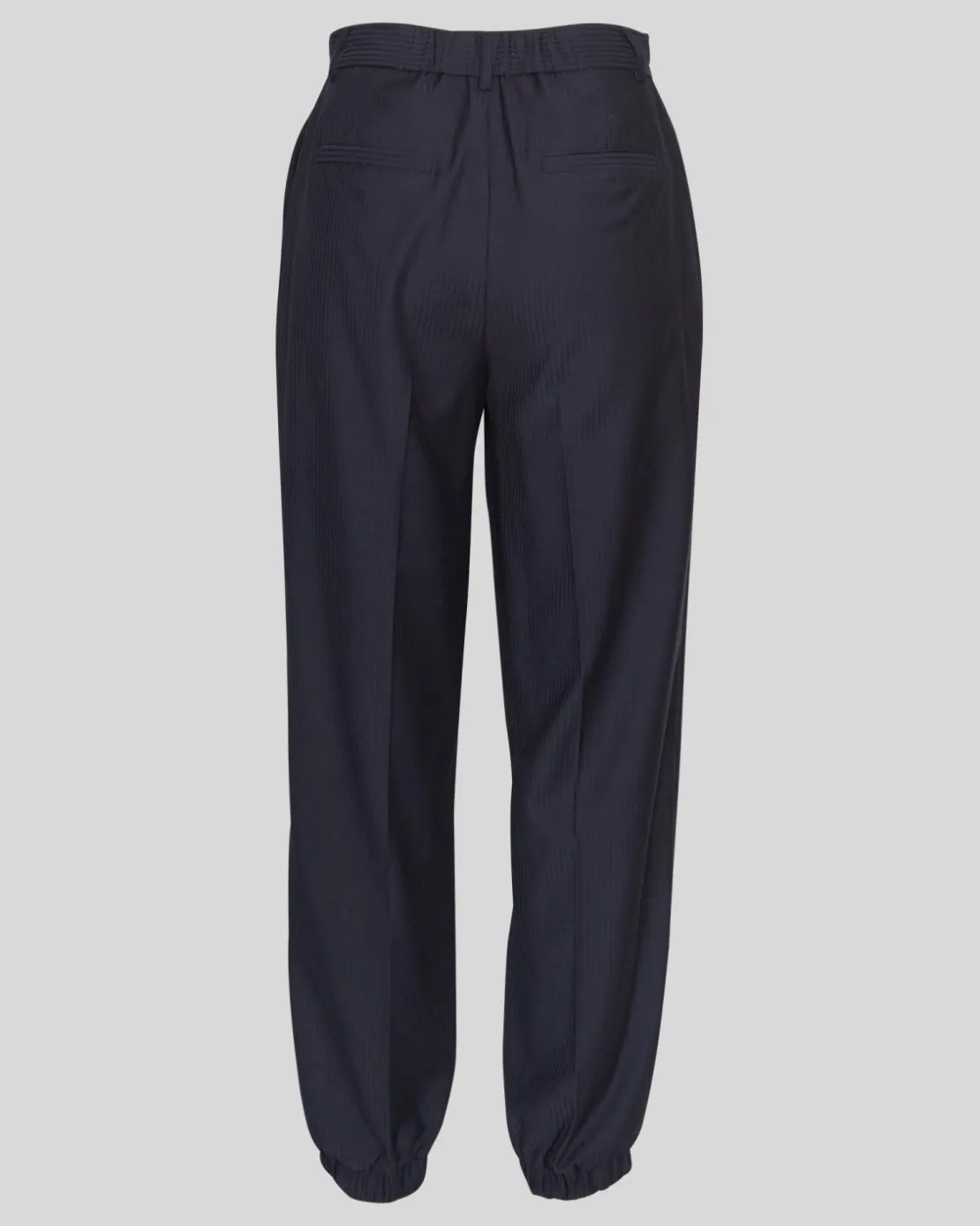 The Maelynn Pants STP are expertly crafted from a luxurious wool blend, offering both warmth and a refined tailoring finish. The wool in the fabric provides natural insulation while ensuring a sleek and polished appearance, perfect for both casual and formal settings. These pants feature a relaxed, straight-leg silhouette with subtle stripes, and an elastic waistband for added comfort and ease of movement. The elasticated cuffs at the ankles add a modern touch and create a tapered look, enhancing the overall fit. Pair them with the matching blazer or vest for a complete, tailored ensemble ideal for cooler seasons.