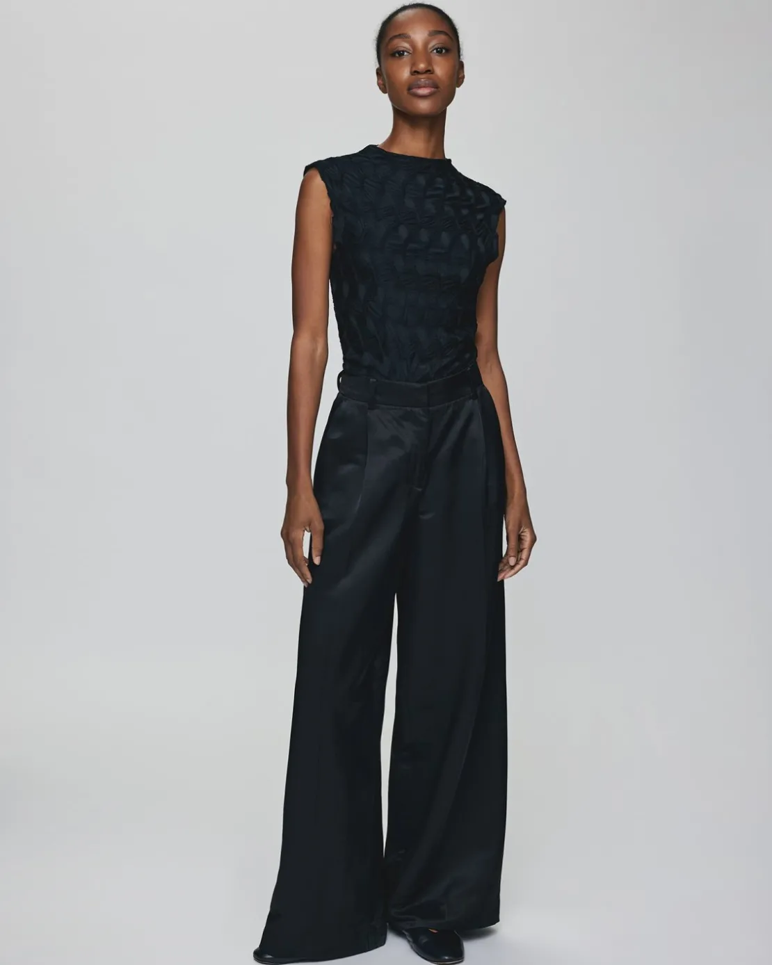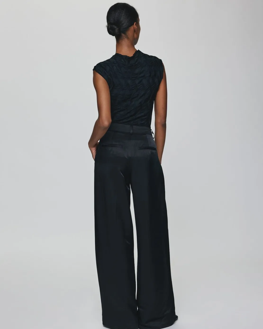 Easy to wear, chic wide-leg fit pants inspired by menswear tailoring. It can be worn casually or dressed up, a high wasitline and pleats structure the silhouette with feminine elegance.