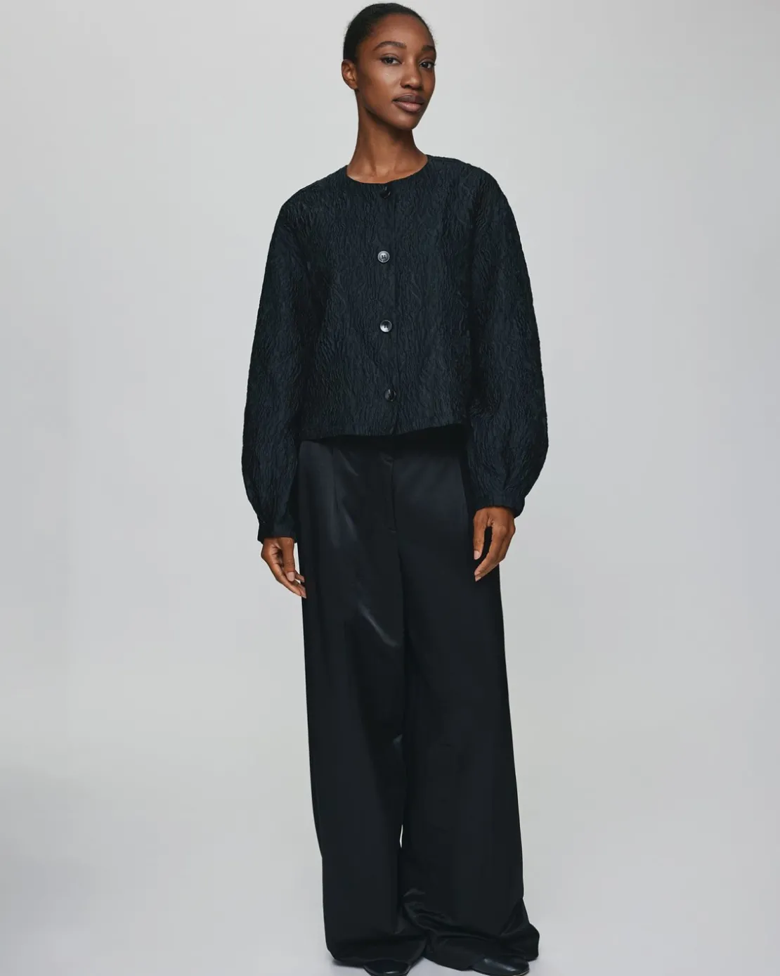 These pants has a loose fit. The model is 173cm and wears a size S.