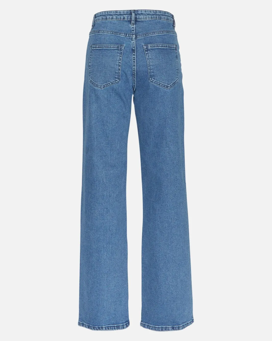 These jeans have wide legs with a slit at the bottom. The jeans features both a zipper and button closing, and has both belt straps and pockets.