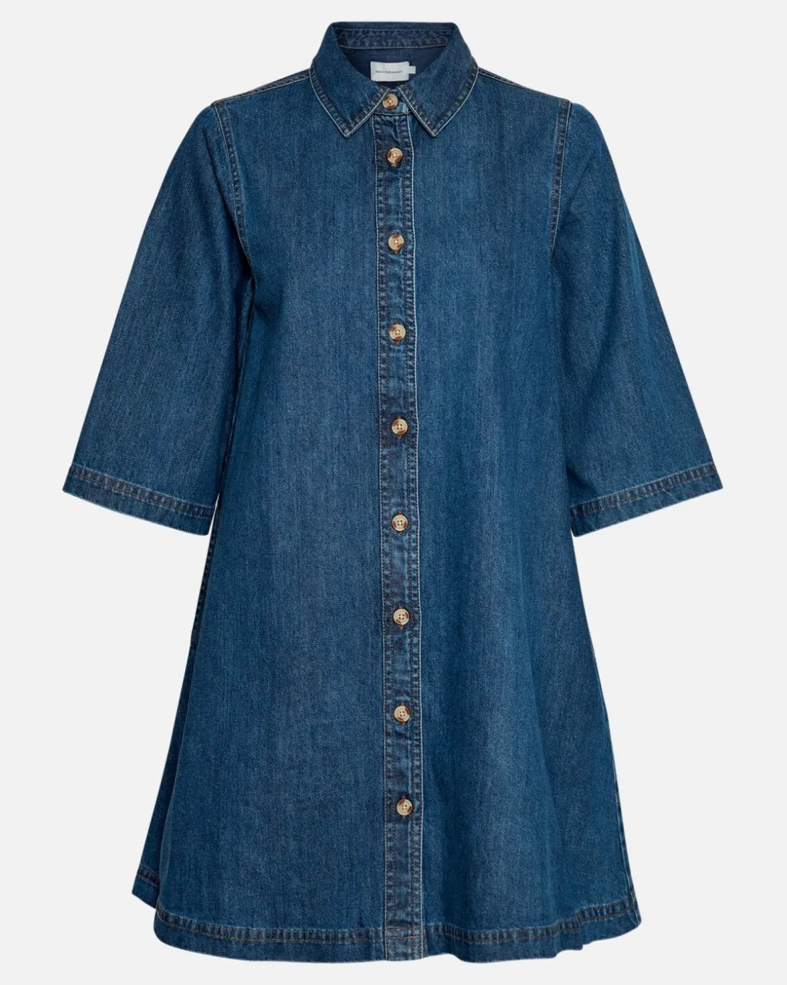 This A-shaped denim dress has a loose fit and all the detail inspired from a shirt. The classic collar, the full placket. The dress also features short wide sleeves. It’s a modern, cool twist to a never ending denim trend.
