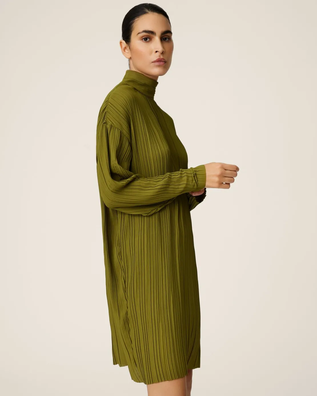 This dress has a loose fit. The model is 177cm and wears a size S.