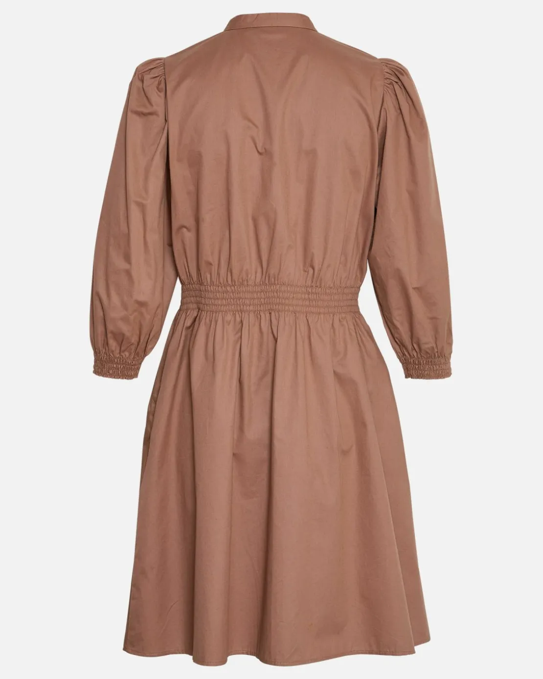 This dress has 3/4 balloon sleeves and mock detail on the back.