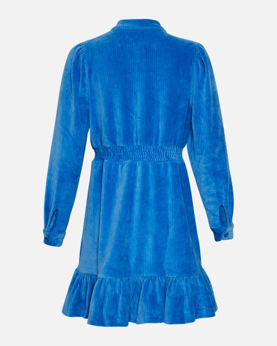 Long sleeve courduroy dress featuring button closure, frill details at the hem landing just below knee. Smock waist detail slims the waistline and shoulder gatherings make a pretty silhouette.
