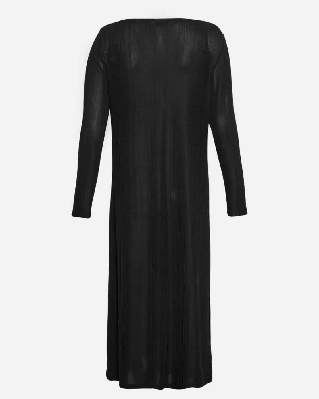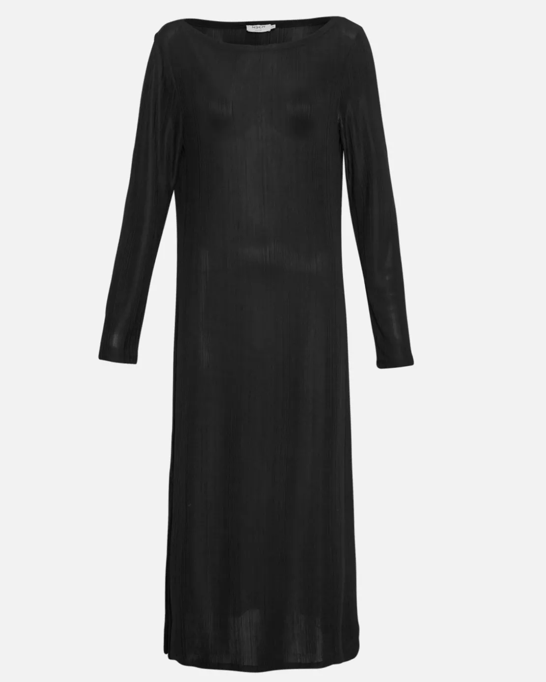 Master an effortless look with this simple yet elegant black dress. Round neckline, side slits and a beautiful fabric make a flattering silhouette. Add an oversized jacket or a tailored blazer and consider your evening outfit ready.