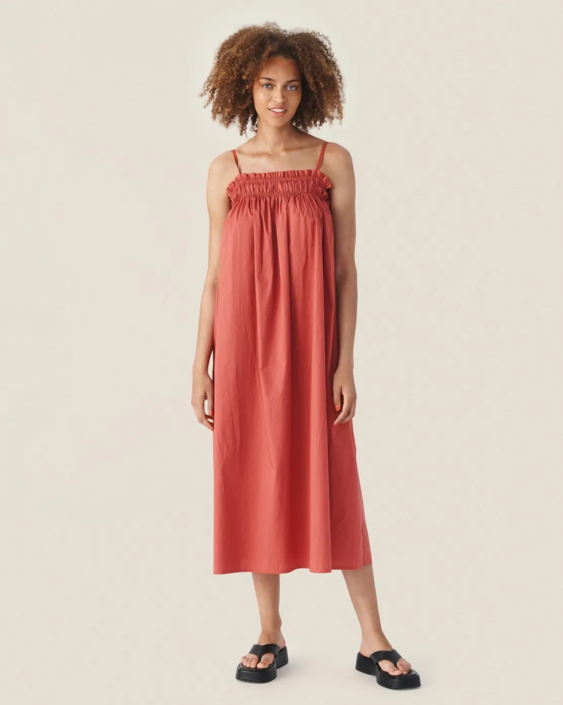 Fitting This dress has a relaxed fit.Composition97% Cotton & 3% Elastane. Long strap dress- Elastic detail at the chest