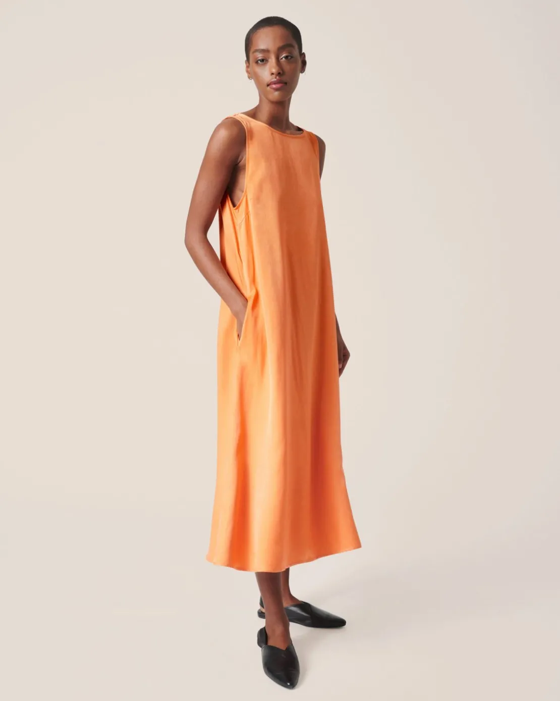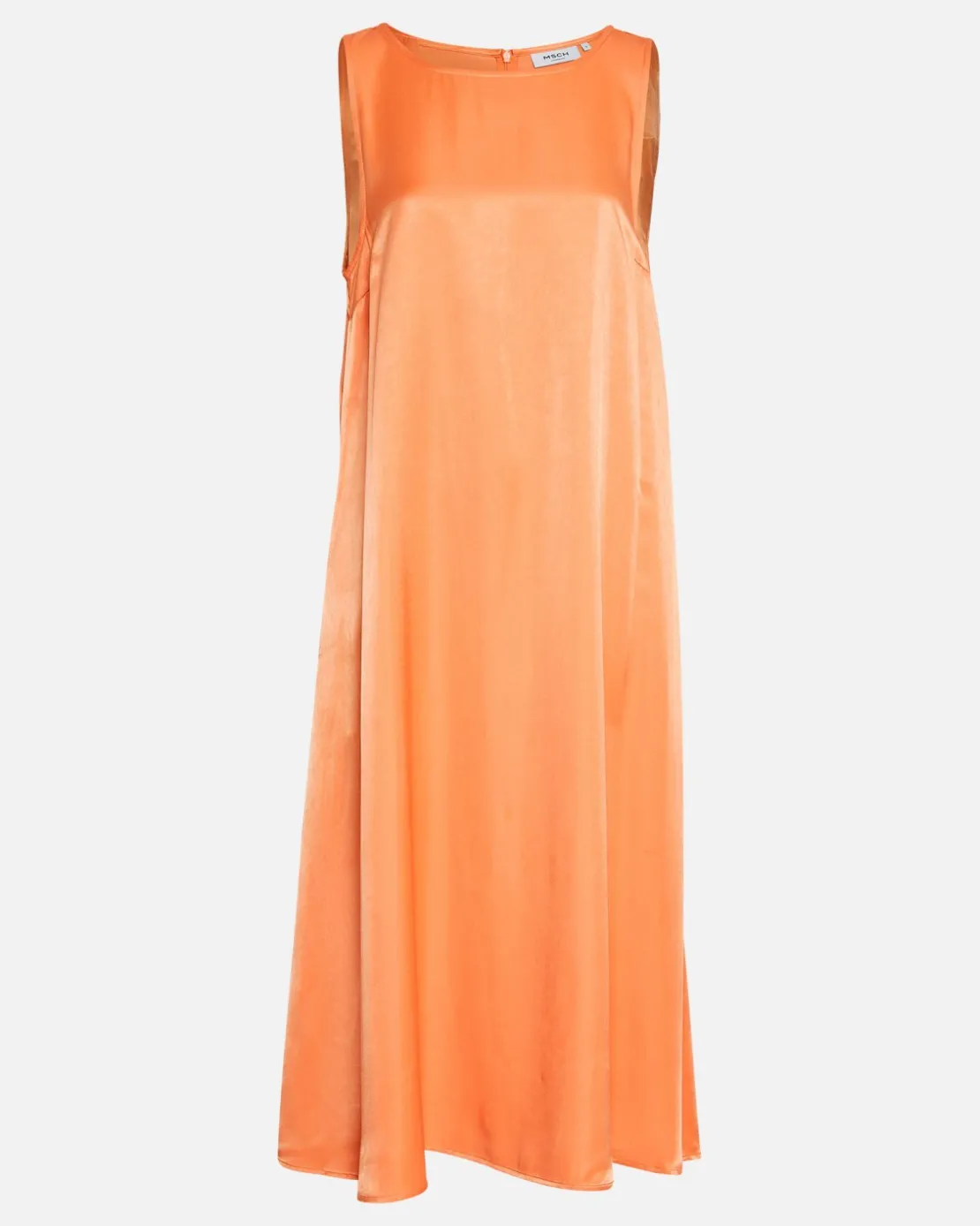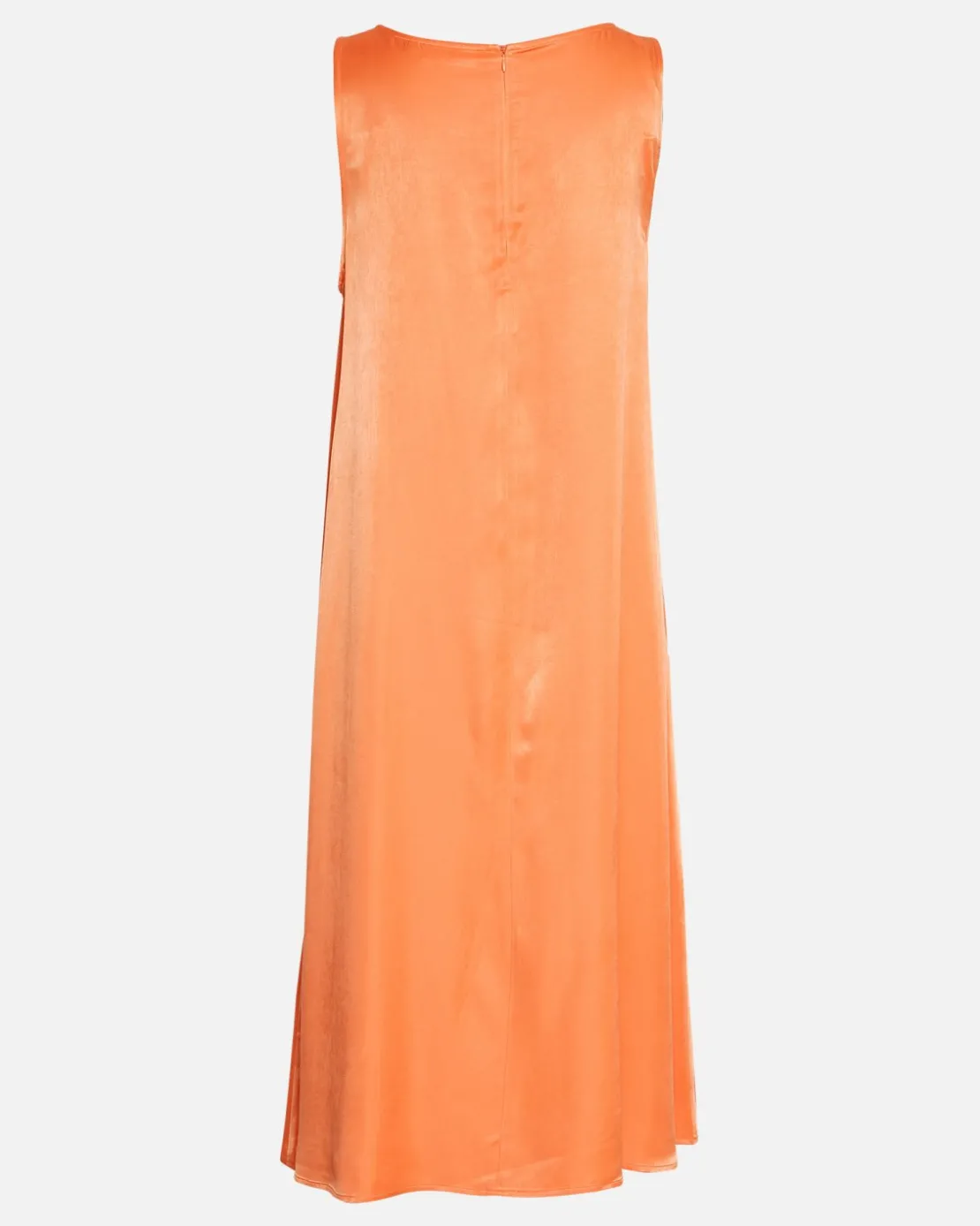 This loose fit, mid length dress is sleeveless and has a zip closue on the back.