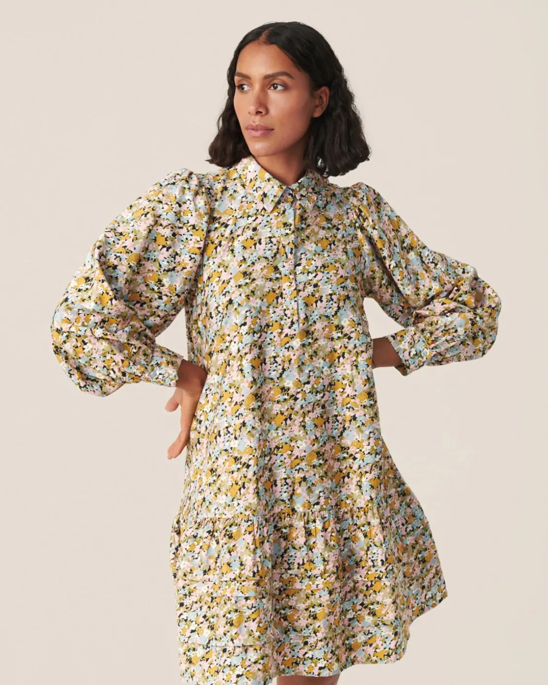 This dress has a relaxed fit. The model is 177 cm tall and is wearing a size S.