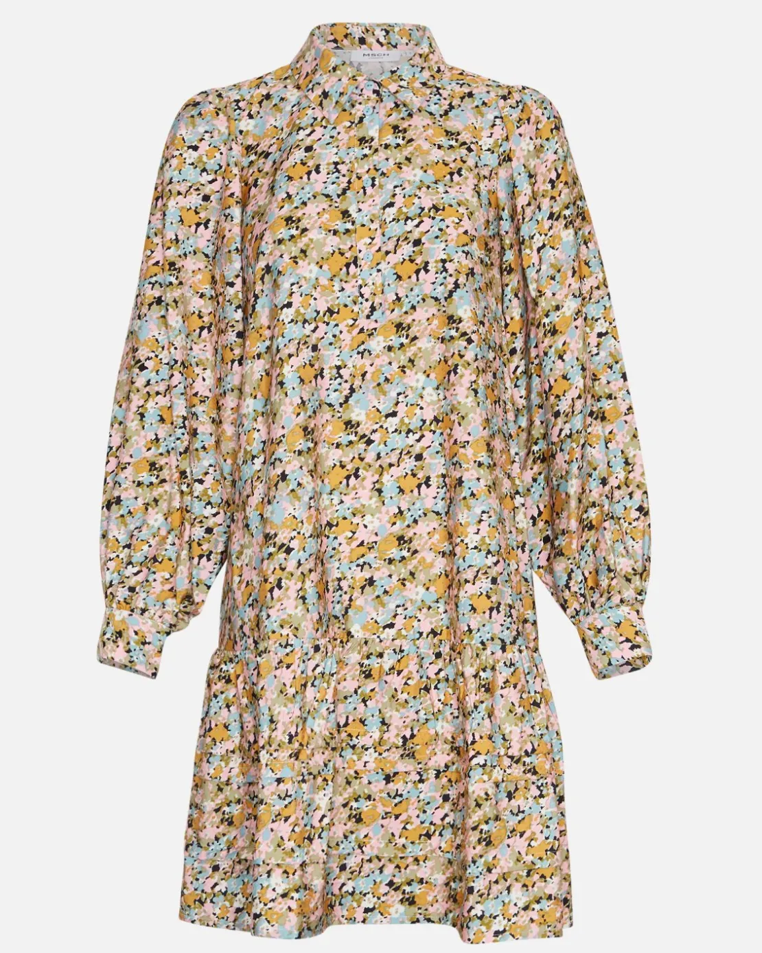 This dress has a half placket detail, with a shirt collar and 2 button closing on the cuffs.