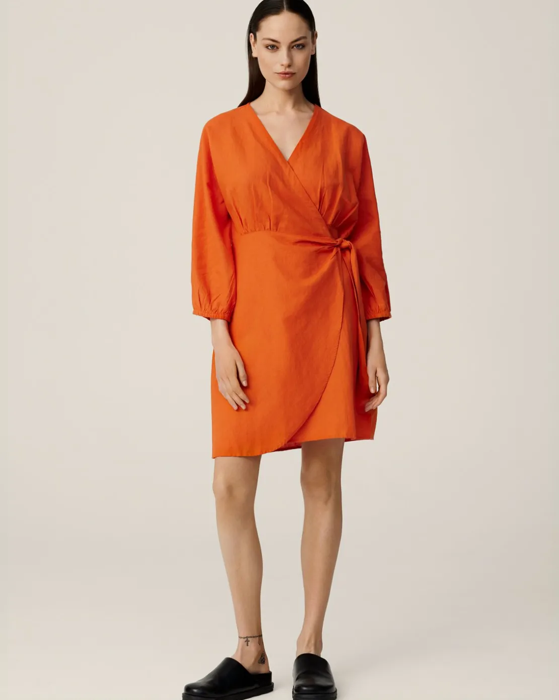 Mirilla is our linen-cotton blend material, perfect for warm summer days. This dress has a wrap feature, so you can adjust how tight you wish it to be. The dress has a V-neck and 3/4 sleeves. Style it with our basic colection underneath, as linen in light colours can be slightly seethrough.