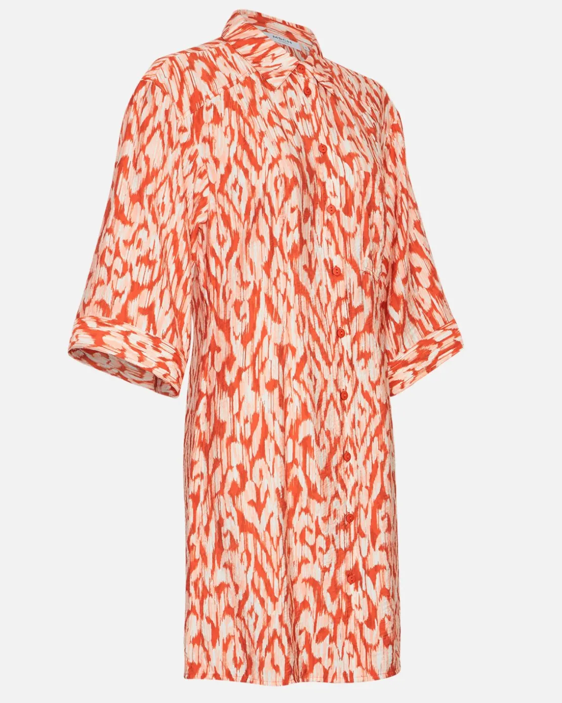 Short shirt dress with light fabric. It has a beautiful all-over print that can be styled in many ways. The feminine fit gives a flattering look. The dress has wide 3/4 sleeves and a pocket on the chest.