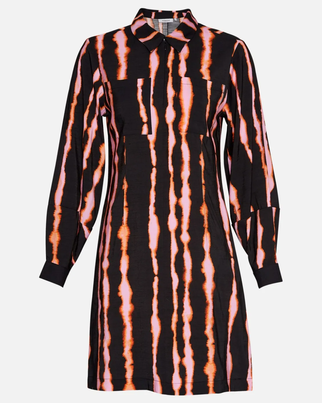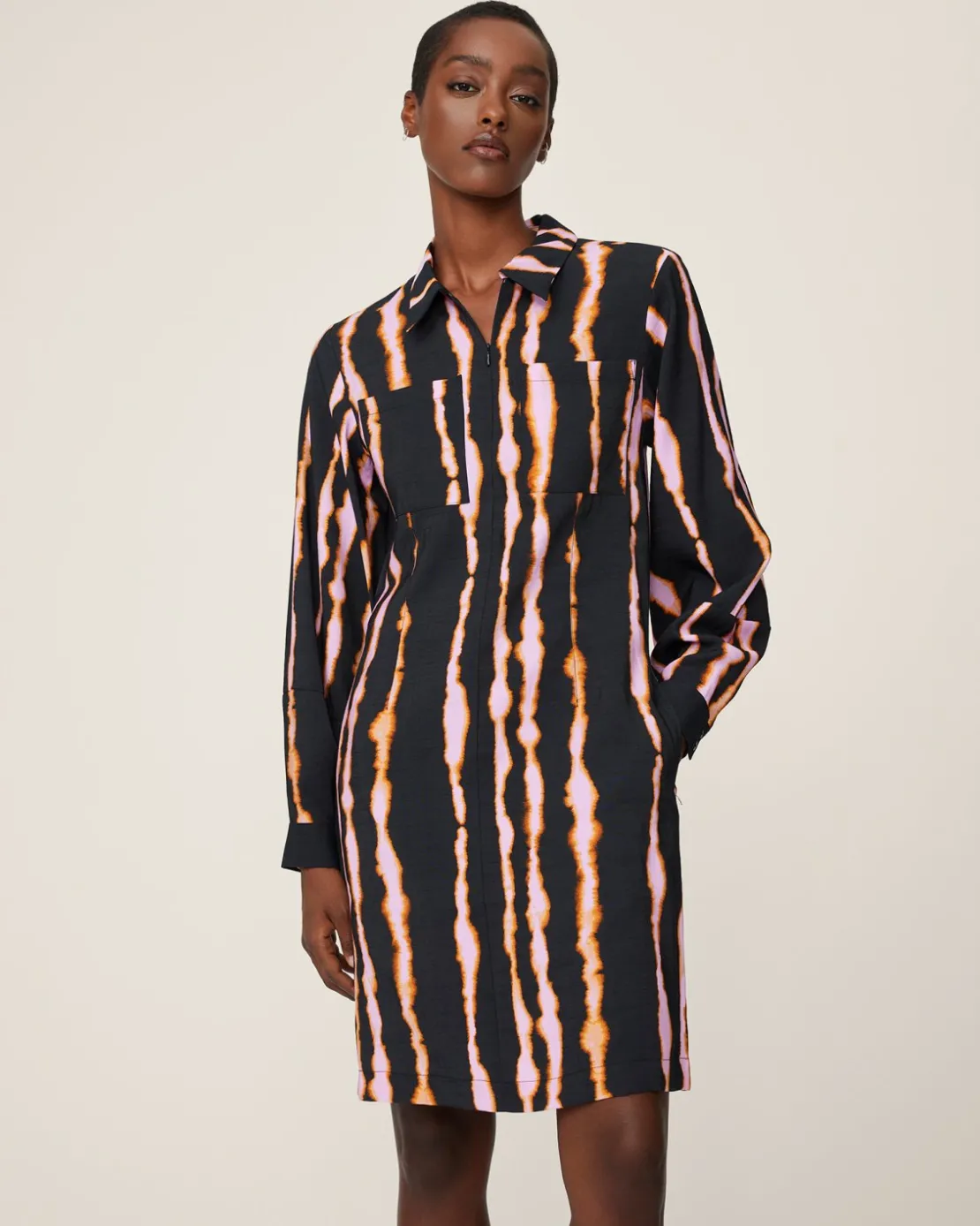 This short dress boasts a captivating printed pattern, adding a touch of feminine charm to your look. It features a V-neckline, shirt collar and volume sleeves, offering an elegant and flattering silhouette. What makes this dress an outstanding piece is the front zipper closure, allowing you to play with the neckline cut, depending on the occasion and your mood. The horizontal printed design, the front zipper closure and short length of this dress make for gorgoues legs and a feminine figure. The two front pockets will add functionality to your outfit, while remaining effortlessly chic. Selfrida will elevate your style game and make a statement wherever you go.