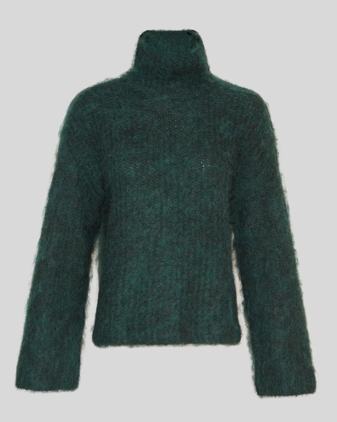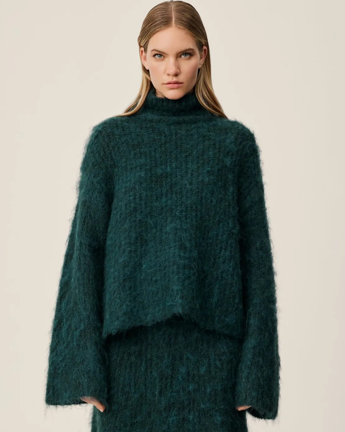 This pullover is crafted from high quality materials, giving the pullover an exclusive feel and instant softness, when worn. The fibers used is long haired and can pill when used. The pullover features a turtleneck and wide, very long sleeves.