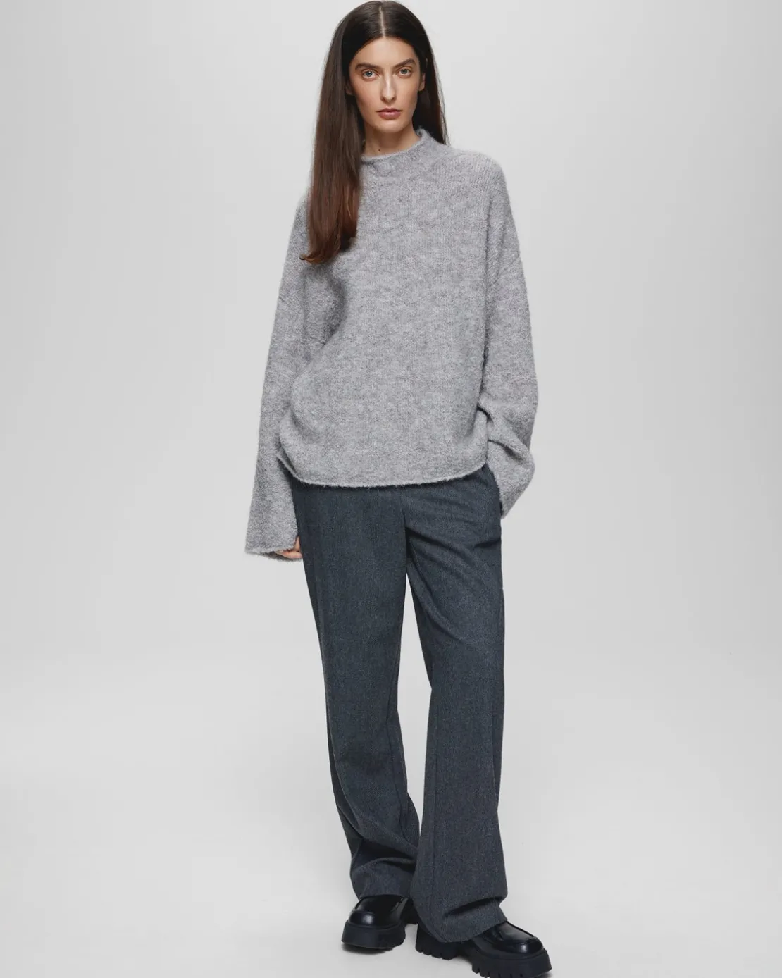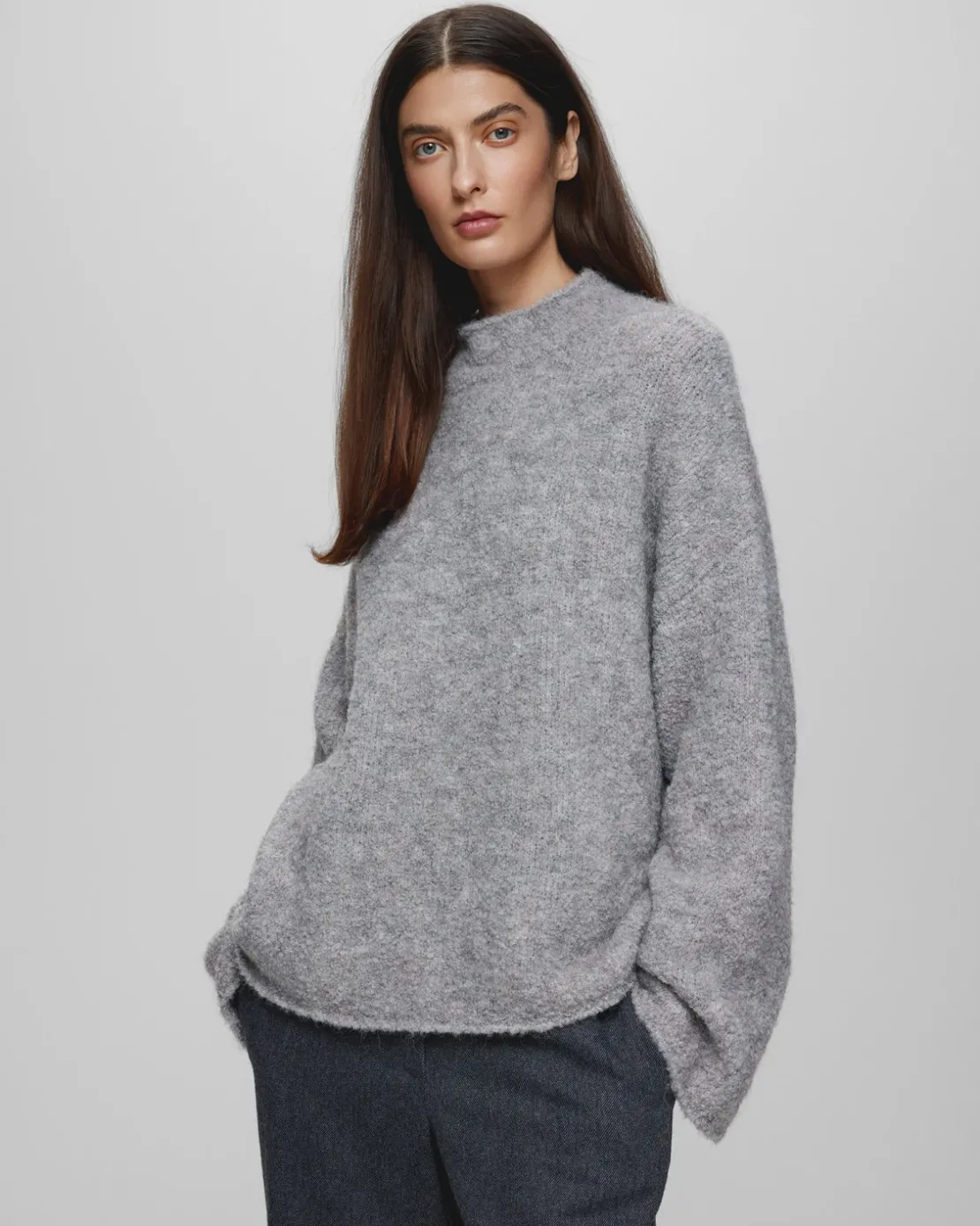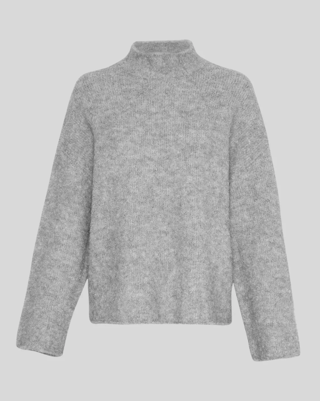The Bathilda Erica Pullover in light grey melange is a luxurious knit crafted from a blend of alpaca wool, offering both warmth and softness. This high-neck sweater features a relaxed, slightly oversized fit with dropped shoulders, creating a cozy and effortless silhouette. The plush texture of the alpaca wool ensures comfort and breathability, making it perfect for layering in cooler weather. Whether paired with jeans or a skirt, this versatile pullover is a timeless addition to your wardrobe, blending elegance with the natural qualities of alpaca wool.