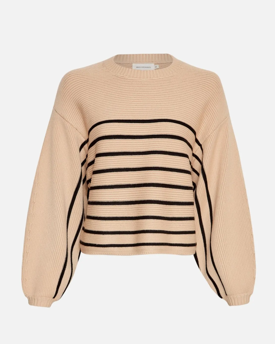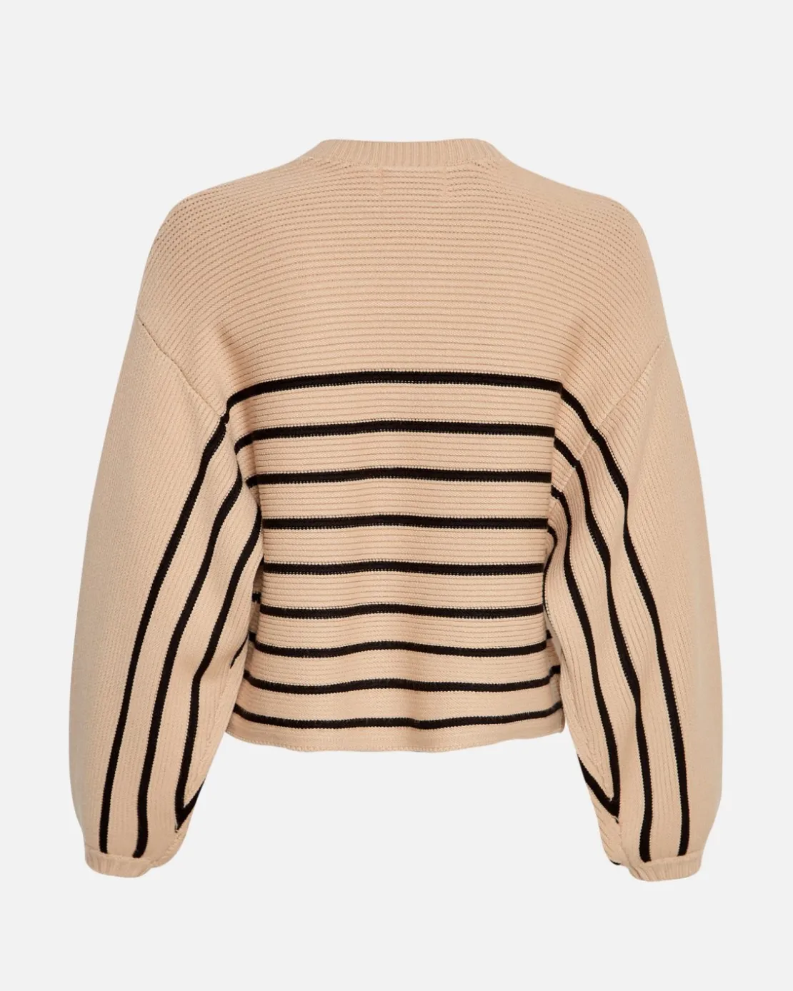 Amari Rachelle er en blød, strikket kvalitet som vil være blid mod huden. Denne striktrøje har løse ballon ærmer med dropped shoulders for at fremhæve det oversized look, og et stribet mønster som er på kroppen af trøjen samt undersiden af ærmerne.