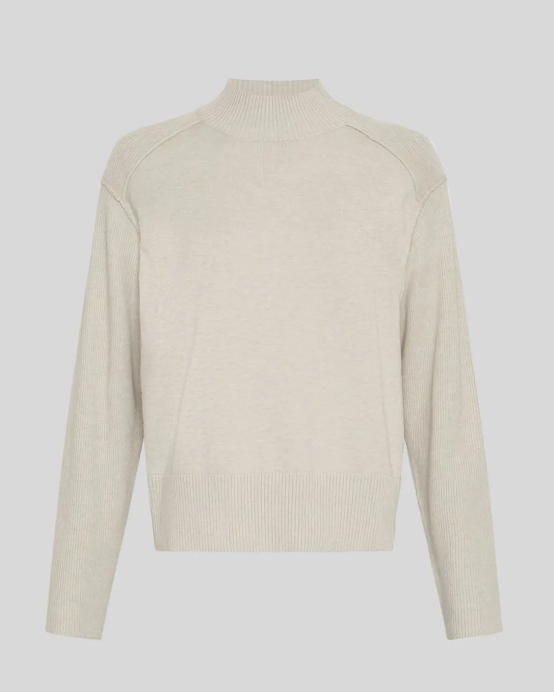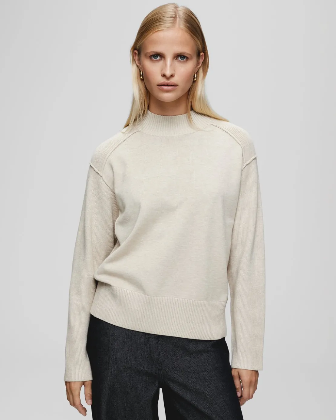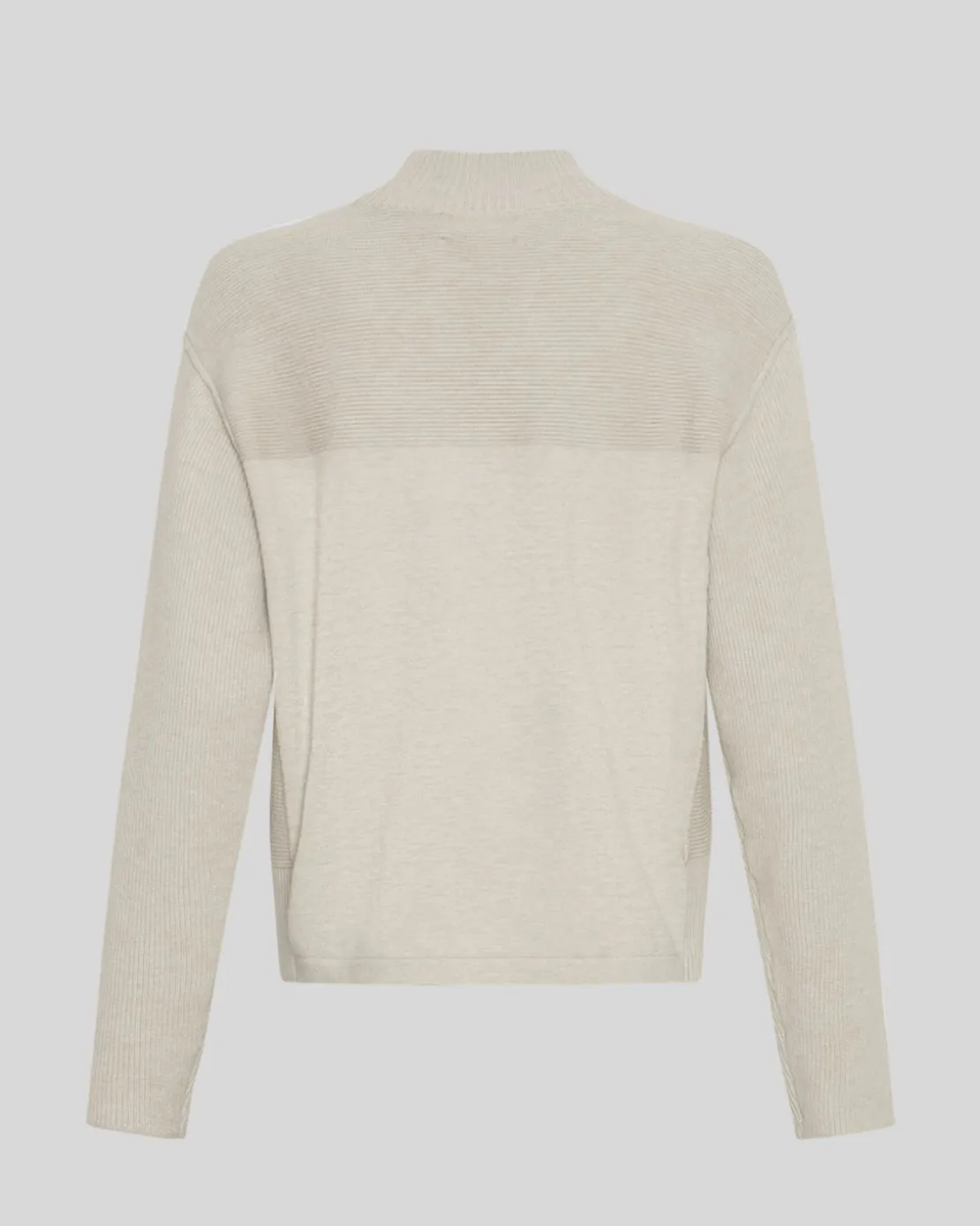 Filucca is a pullover that seamlessly combines two different textures and patterns of knitwear. The mock neck and shoulders going down into the sleeves is in a ribbed quality designes with visible stitches to highlight the change of type of knit. The ribbed goes around and covers the top back. The rest of the pullover is in a classic seamless and soft knit quality.
