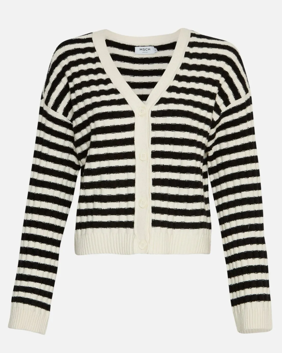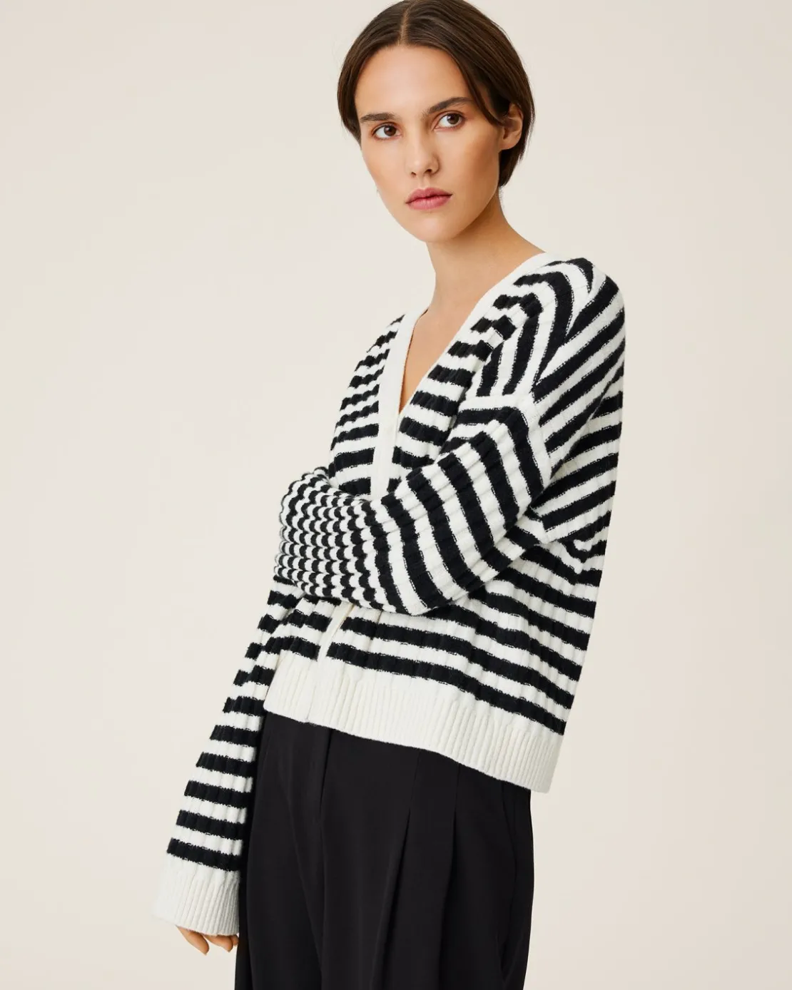 This cardigan has a regular fit with straight cut sleeves. The model is 172cm and wears a size S/M.