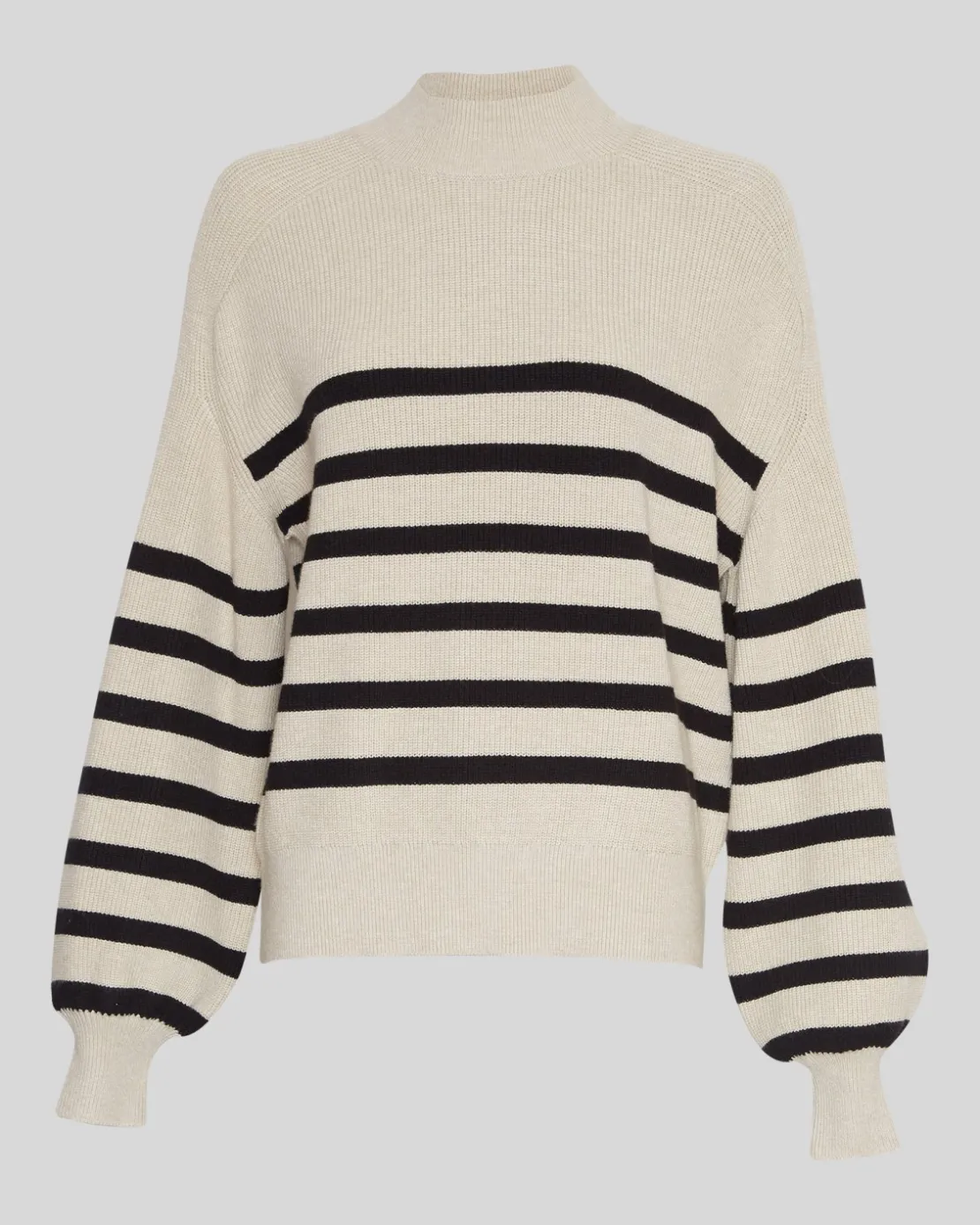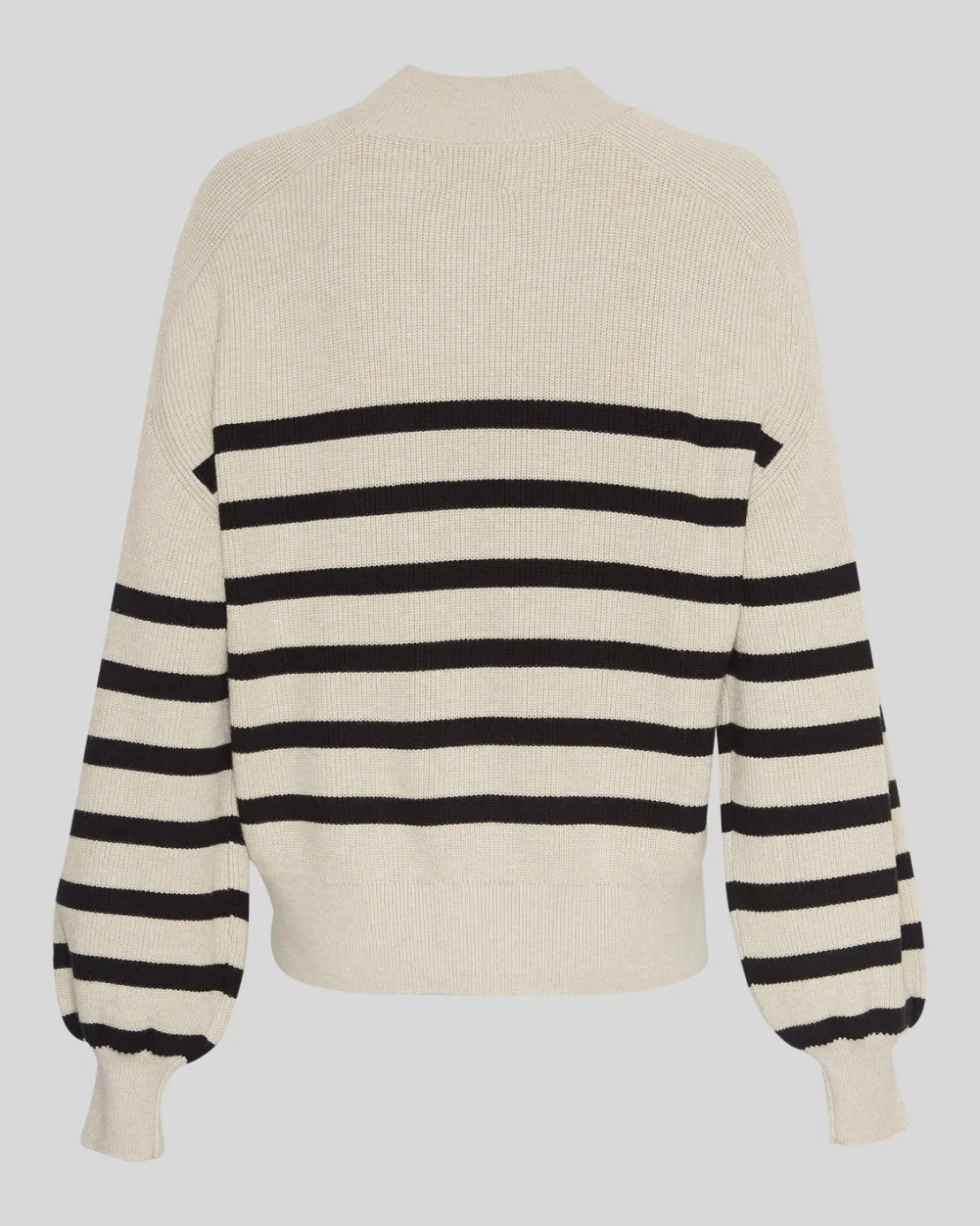 The Maura Rachelle M Pullover STP is a stylish striped knit that combines comfort and effortless elegance. Crafted from a soft and lightweight blend, this pullover features classic horizontal stripes, a relaxed fit, and a timeless round neckline. The ribbed cuffs and hem provide added structure, while the dropped shoulders give it a laid-back, contemporary feel. This versatile pullover is perfect for casual days and can be easily paired with everything from jeans to skirts for a chic, everyday look.