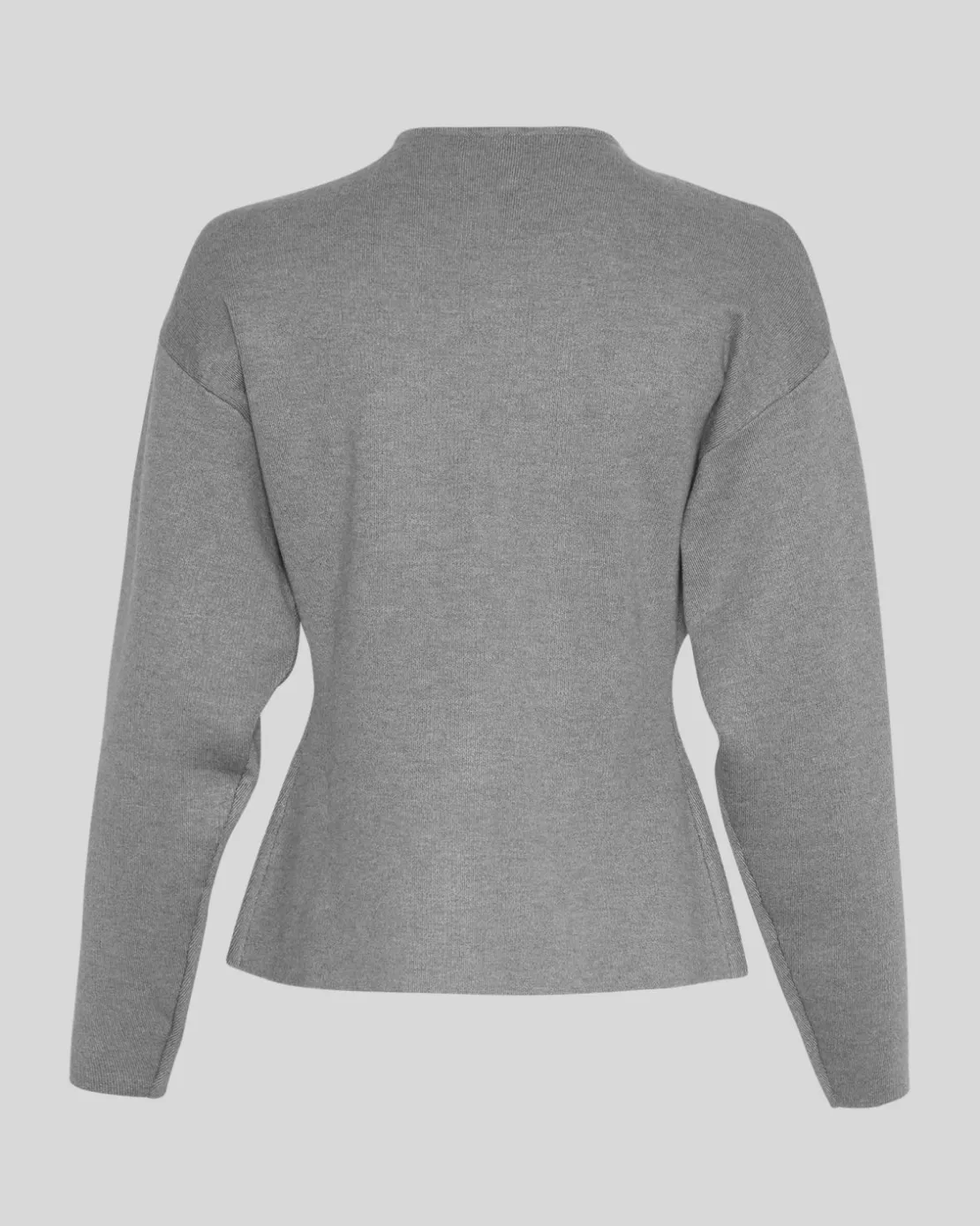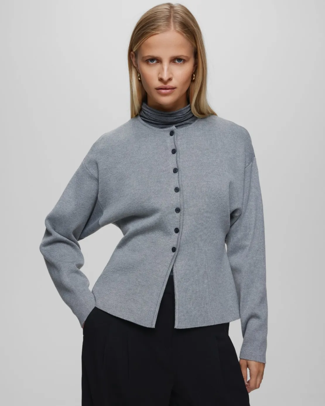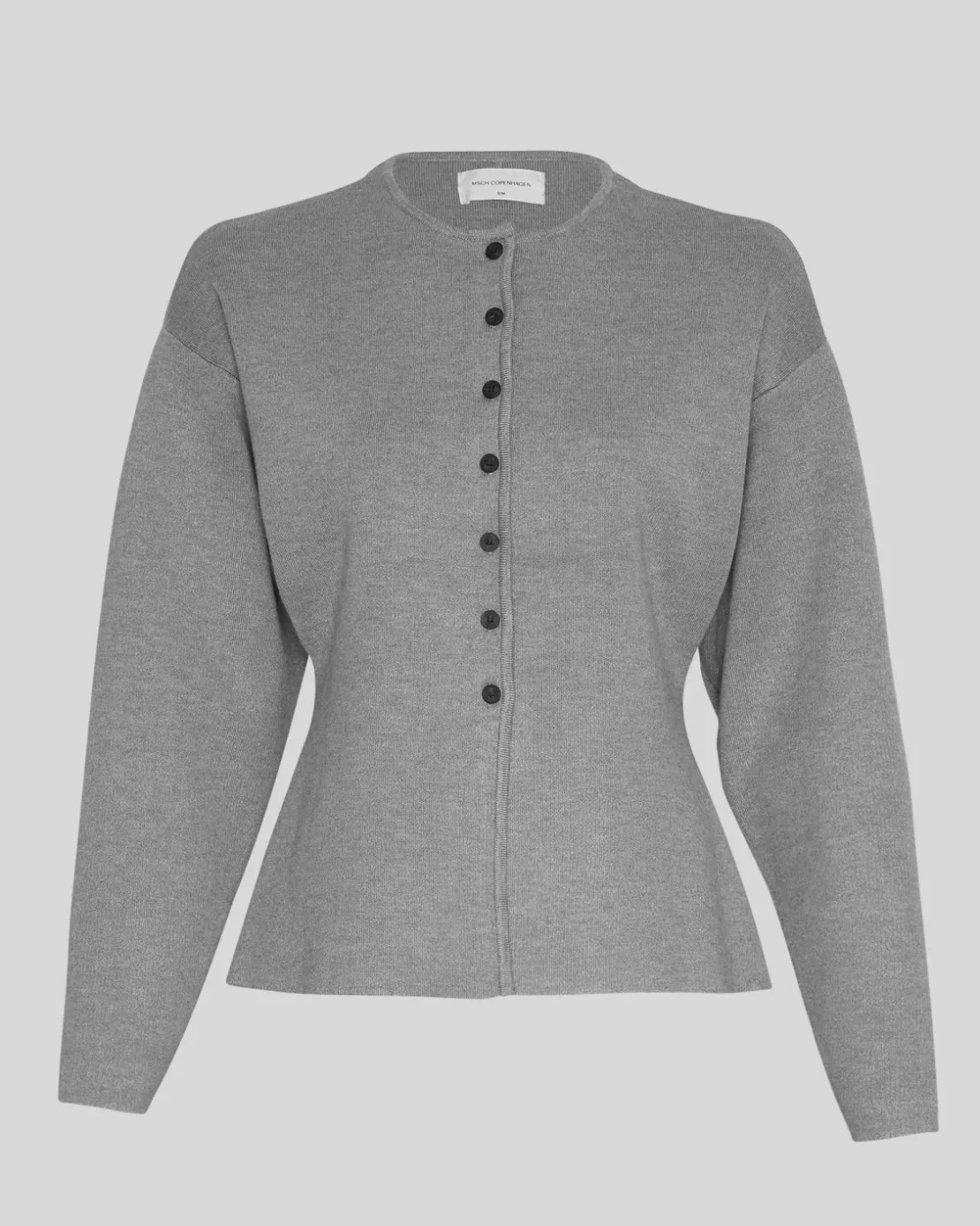 The Mirielle cardigan is a soft yet firmly knitted cardiagn with an extraordinary silhuouette. It features a round neckline, with dropped loose shoulders and sleeves, creating a voluminous top of the style. The waist is snatched, creating an hourglass shape. The buttons only goes around half way down the front. Style this with a pair of suit pants for the perfect combination of business and casual.