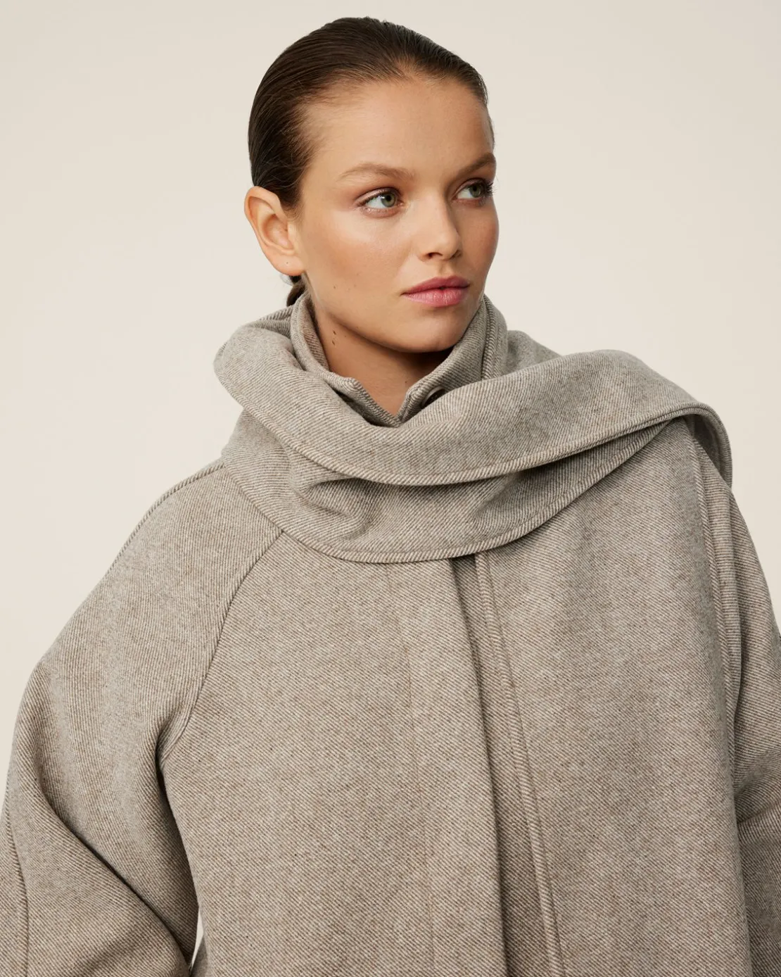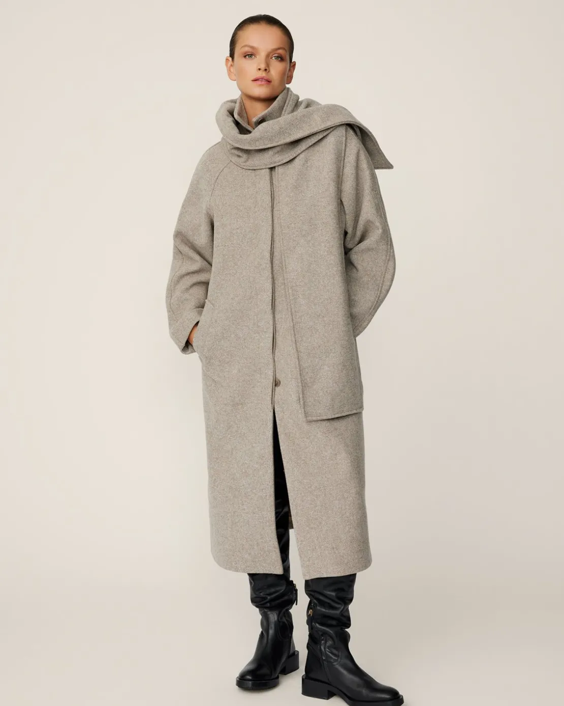 A cozy and stylish essential for the colder season in a beautiful wool blend. This timeless piece has ample detailes making it a one-of-a-kind jacket with a timeless appeal. A unique element of this wool jacket is the detachable scarf, providing not only warmth but also adds versatility to your outfit. Wear it with the scarf for a cozy feel, leave it open to drape gracefully on the sides or remove it for a clean appearance. Crafted with care, the luxurious texture with the durable twill fabric is designed to keep you warm, cozy and in-style for the years to come. Whether you are layering it over a feminine dress for a sophisticated evening or pairing it with your go-to jeans and white shirt for a casual day, this jacket is a must-have for those who appreciate Scandinavian simplicity and a timeless design.