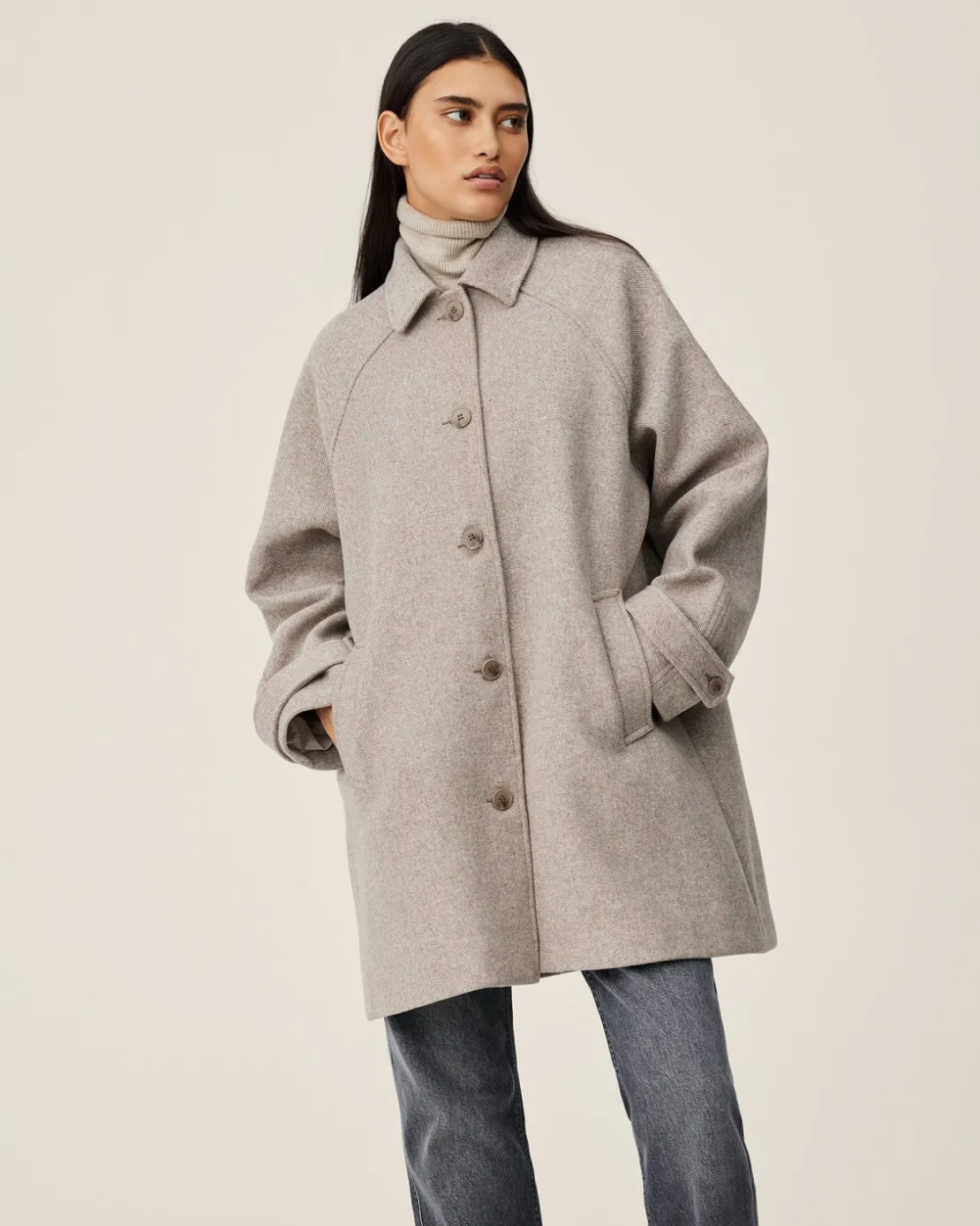 A cozy and stylish essential for the colder season in a beautiful wool blend. This timeless piece has ample detailes making it a one-of-a-kind jacket with a timeless appeal. Crafted with care, the luxurious texture with the durable twill fabric is designed to keep you warm, cozy and in-style for the years to come. Whether you are layering it over a feminine dress for a sophisticated evening or pairing it with your go-to jeans and white shirt for a casual day, this jacket is a must-have for those who appreciate Scandinavian simplicity and a timeless design.