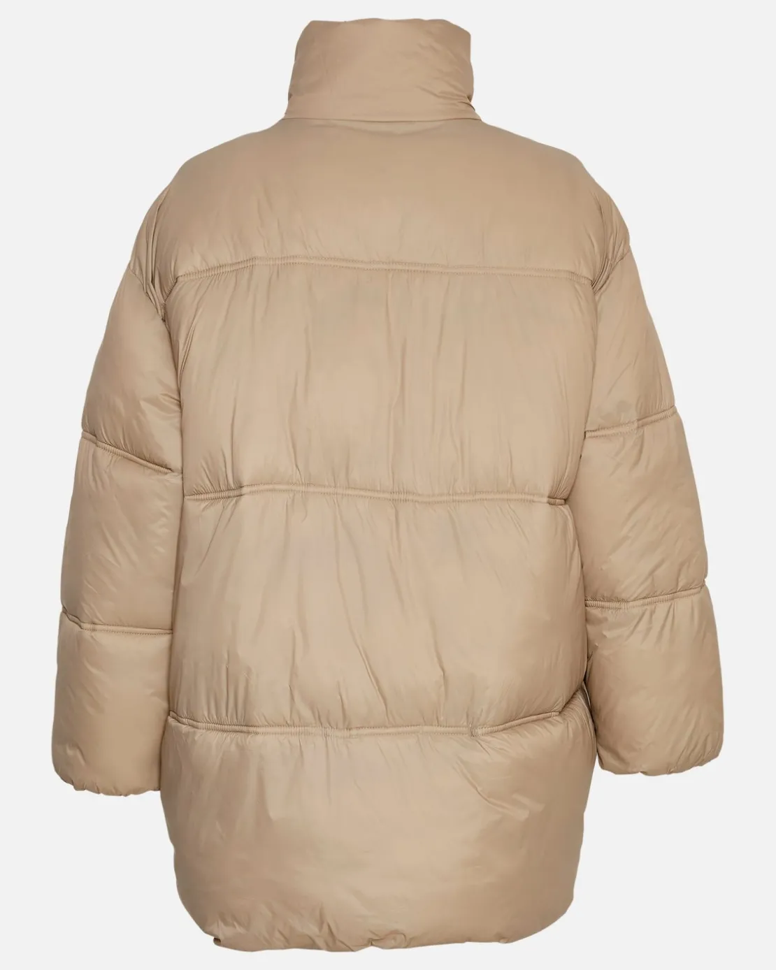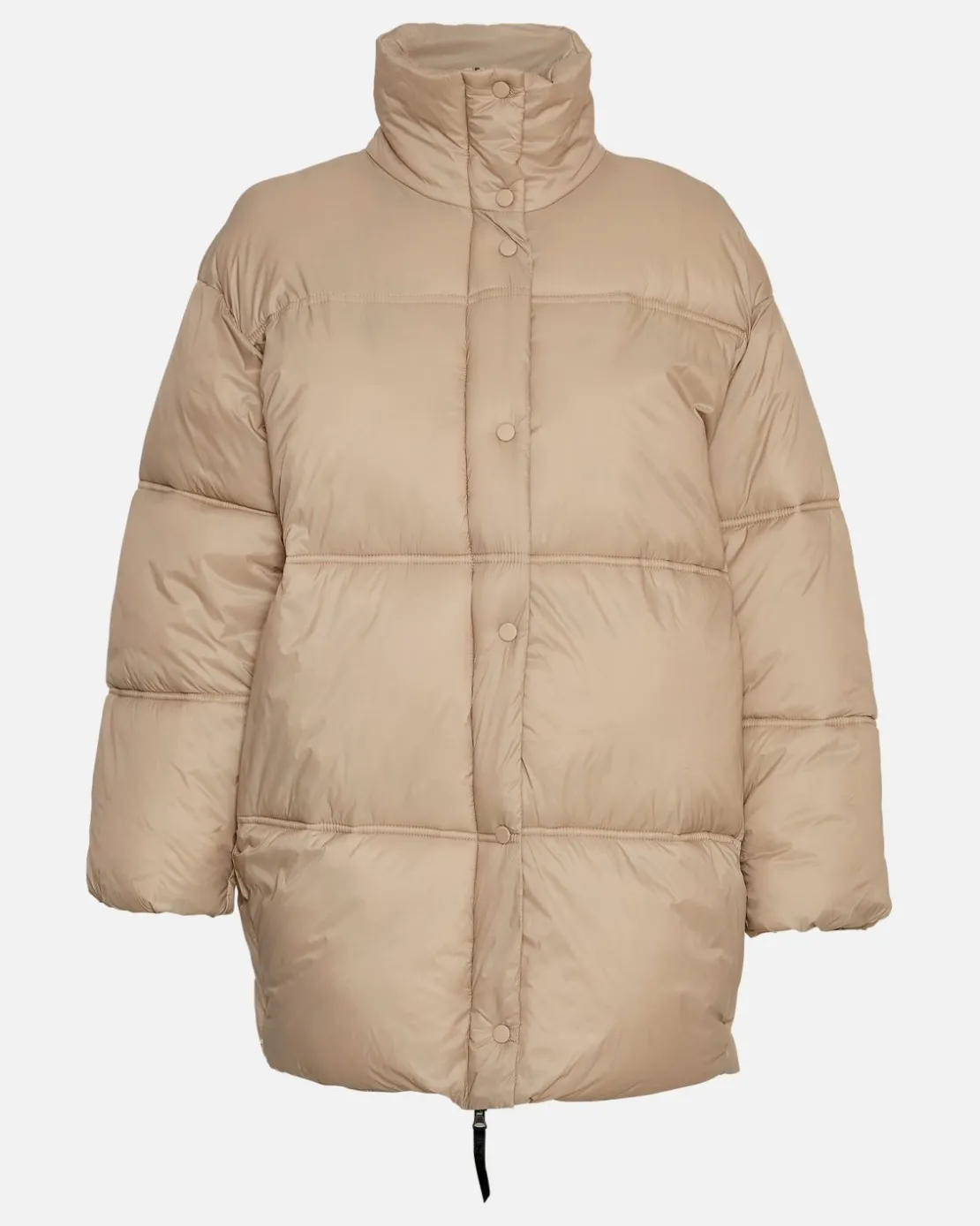 This statement piece is designed to give you a cool and chic style with its light down look. This puffer features a zipper closure with fabric covered buttons to give it a touch of retro charm. The oversized fit offers a modern touch, making it the perfect choice for those seeking a bold fashion statement. The high neck dettail offers extra insulation against the cold, and the side pockets provide a functional feature to this jacket. Pair with your chic wide-leg jeans for a stylish outfit and layer under with your favorite winter pieces.