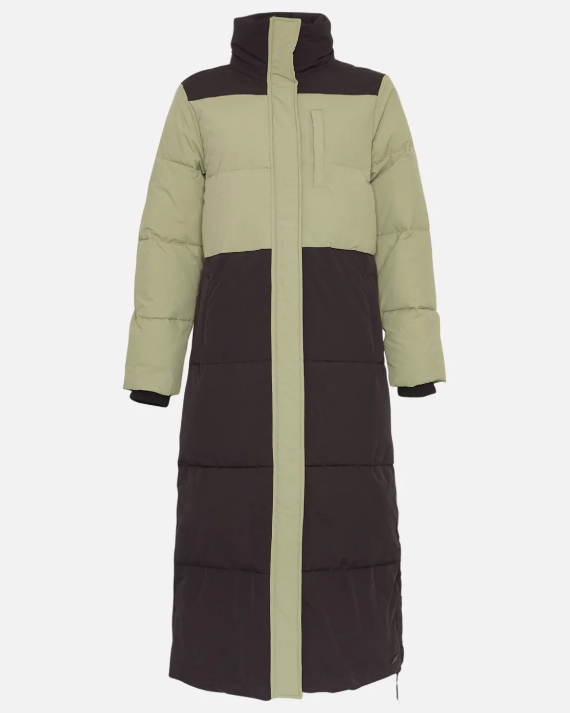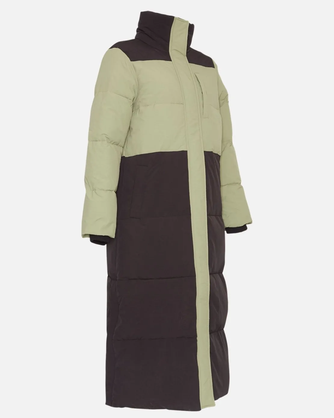 The Evanna features both buttons and a two-way zip up, it has two side pockets and a slide split with a zipper.The jacket is designed with a cool colourblock effect to give it a more cool vibe.