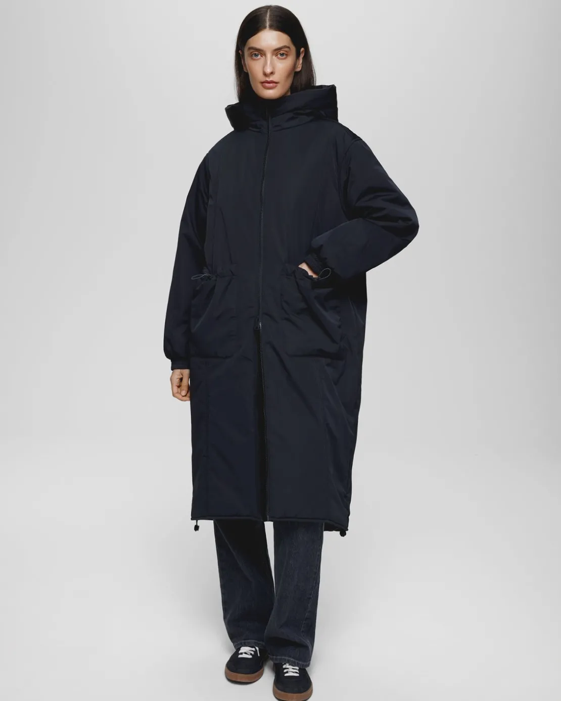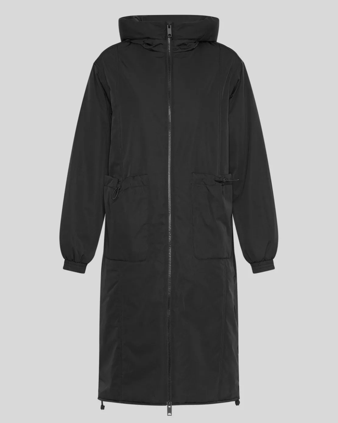 A transitioal jacket for Autumn, in a mat finish. This jacket is filled with little details making it both practical and beautiful. It features a hood and a high neck to ensure full coverage, big front pockets with an elastic closing similar to the elastic hem of the dress that is also adjustable.