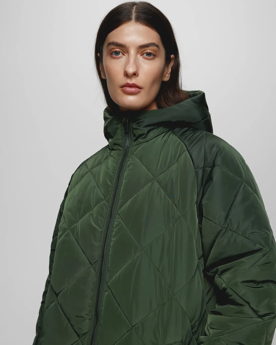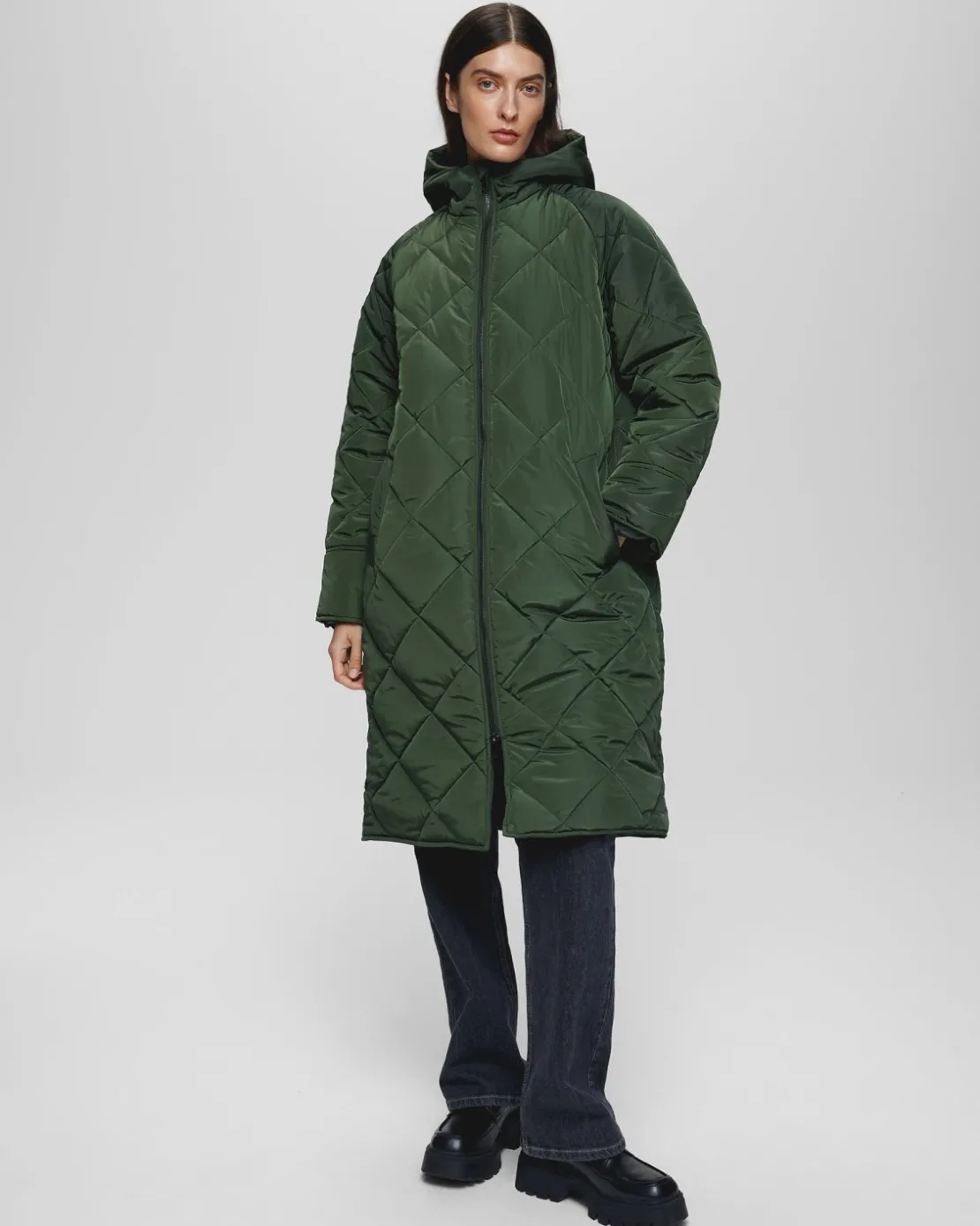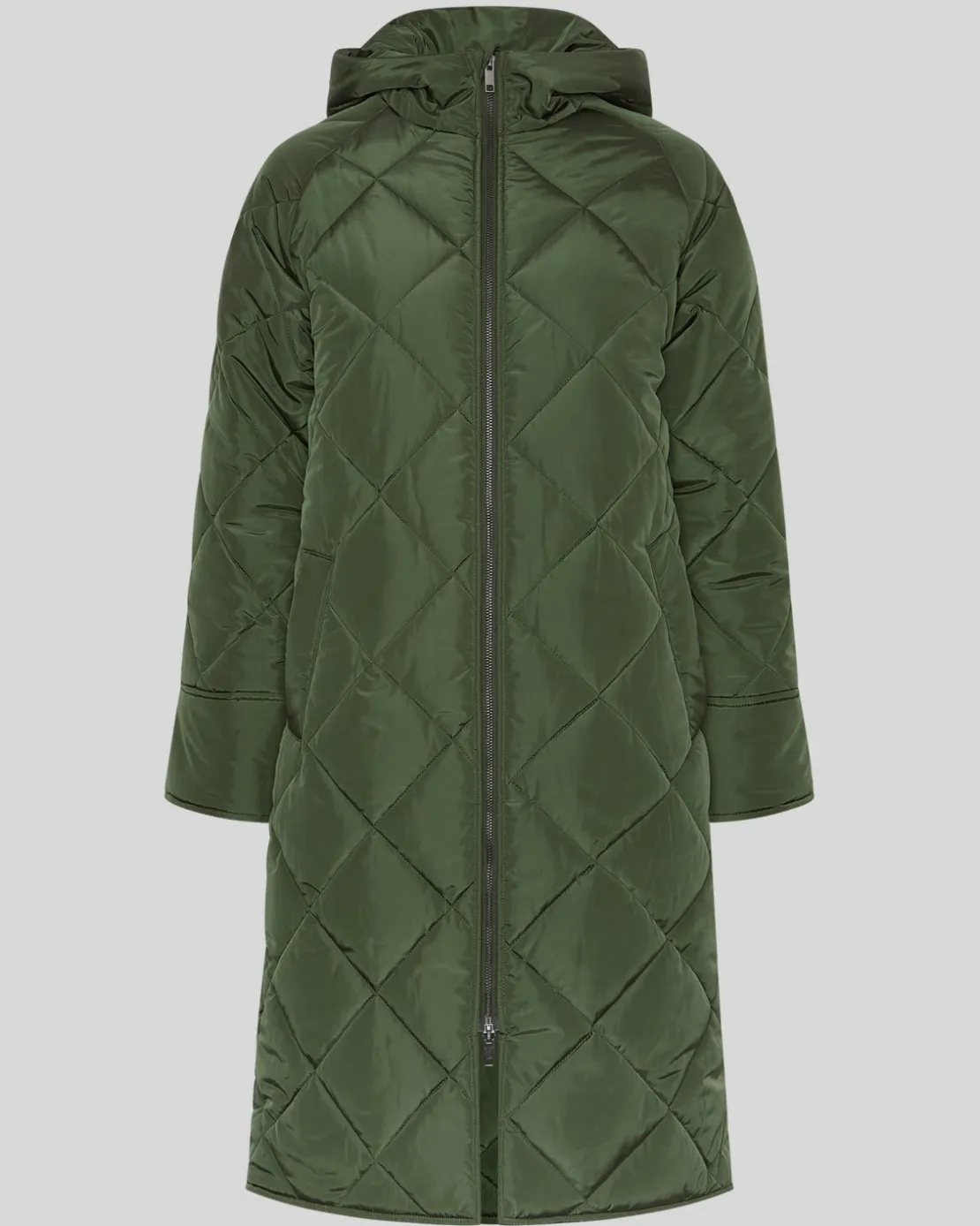 This lightly quilted jacket is the perfect season transitional jacket. It’s light yet keeps you warm and is in a longline design. The jacket features a high neck and a hood, with long semi wide sleeves and a two-way zipper for closure. There is two front pockets as well.
