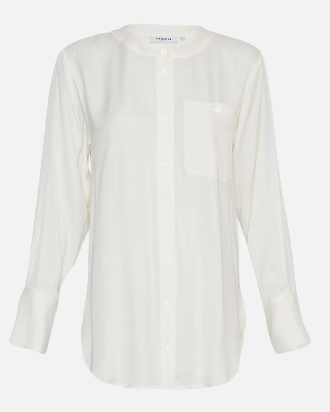 Our Adienna shirt has a silky and glossy surface that reflects light, giving it an elegant and refined appearance. Featuring a front chest pocket and a classic collar, adding a touch of functionality to its sophisticated design.