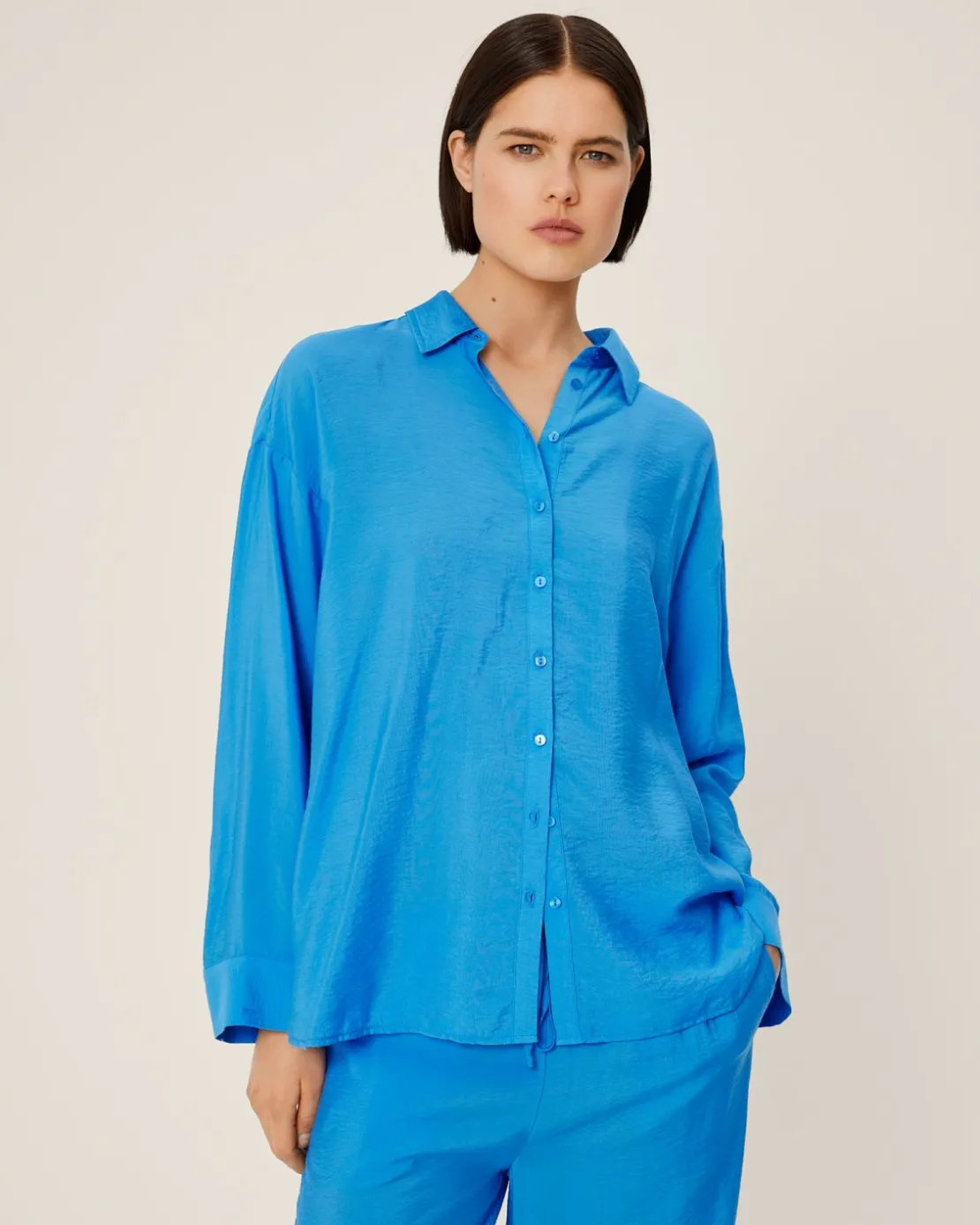 Audia is a favorite here at MSCH, because it’s very lightweight, flowy and breathable. This shirt features a classic collar and placket, with dropped shoulders and extra button detailing at the cuffs. The loose fit gives it an effortless and causal vibe, but it can easily be styles up for a more formal attire. If you love a full set, style the shirt with the matching Audia pants.
