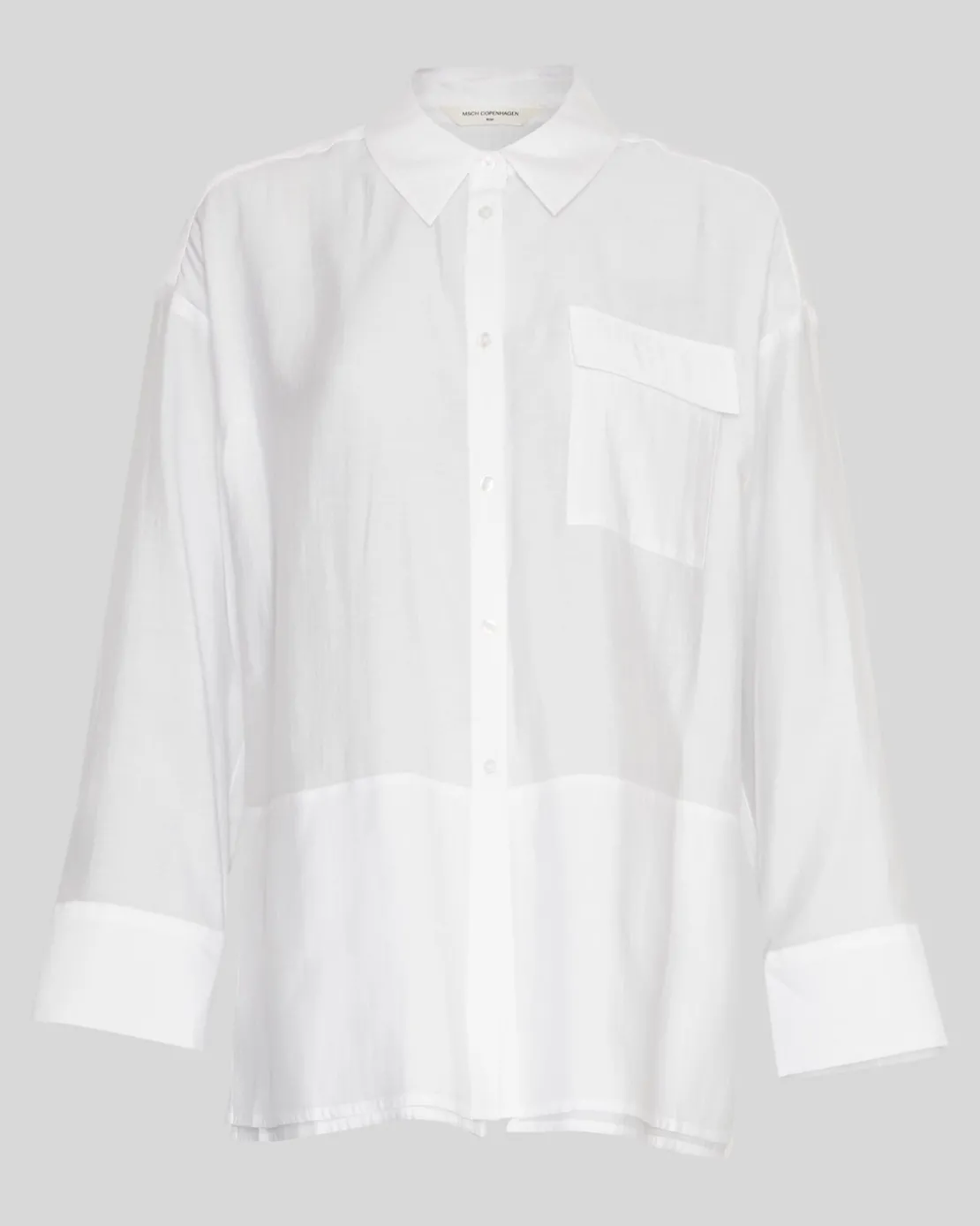 The Barringtong shirt is a classic white shirt that has a long fit, with a double bottom layer to create a colour contrast and with a chest pocket. To enhance the oversized look the shirt also has dropped shoulders and big cuffs.