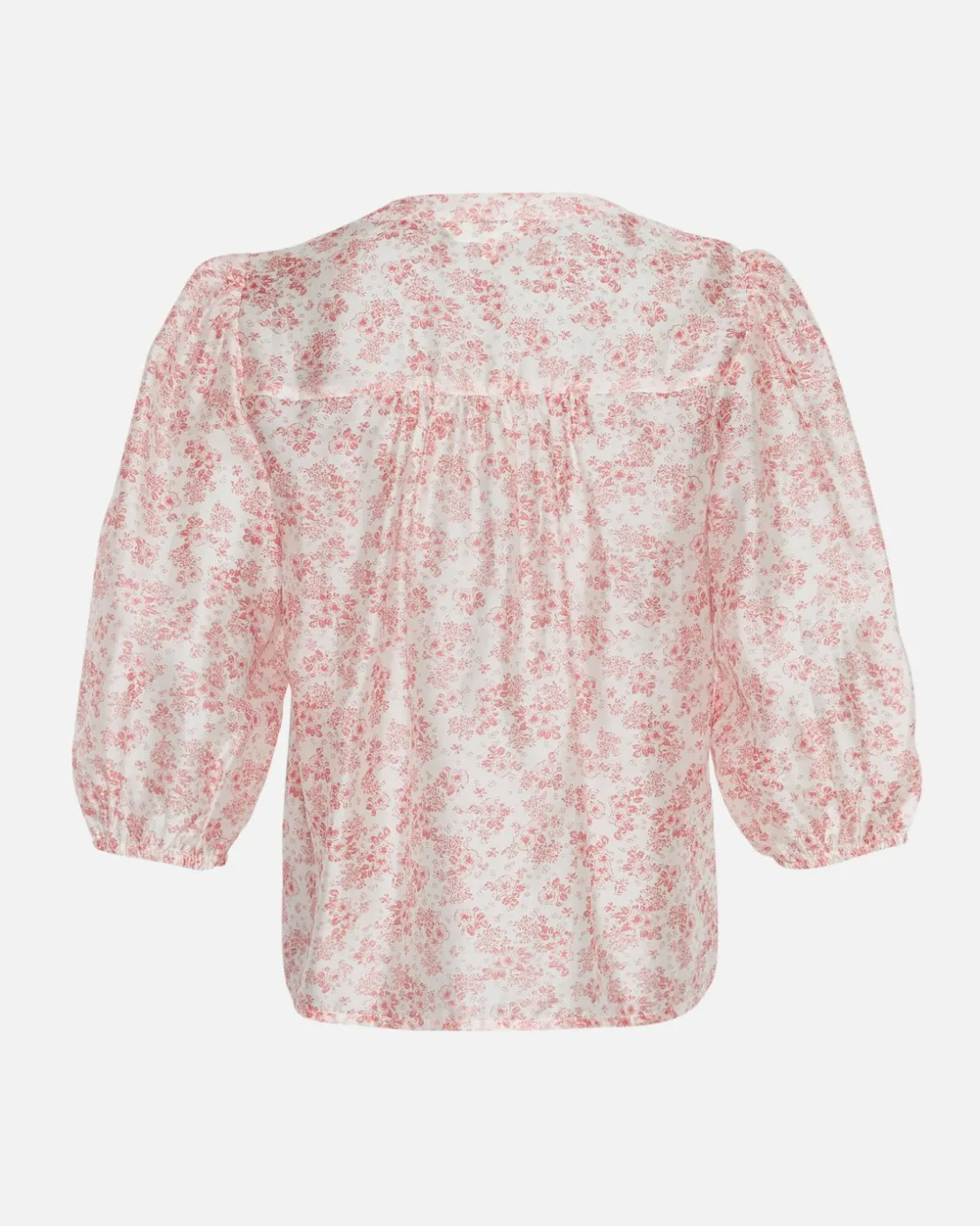 Isadora is a light pink, flowered print that screams summer. This shirt features a 3/4 sleeve with elastic cuffs, a subtle V-neck with buttons all the way through and elastic detailing on the chest. It’s incredibly feminine and can easily be you go-to shirt for warmer days. Style it with light pants to match the soft white nuances of the pattern, or with black or blue to give it some contrast.