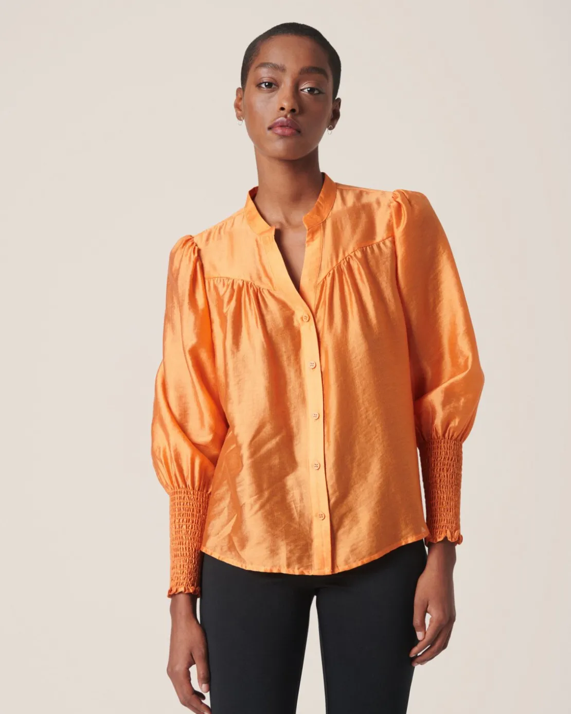 Modern shirt with a half placket detail, puff sleeves with a high smock cuff and puff sleeves.