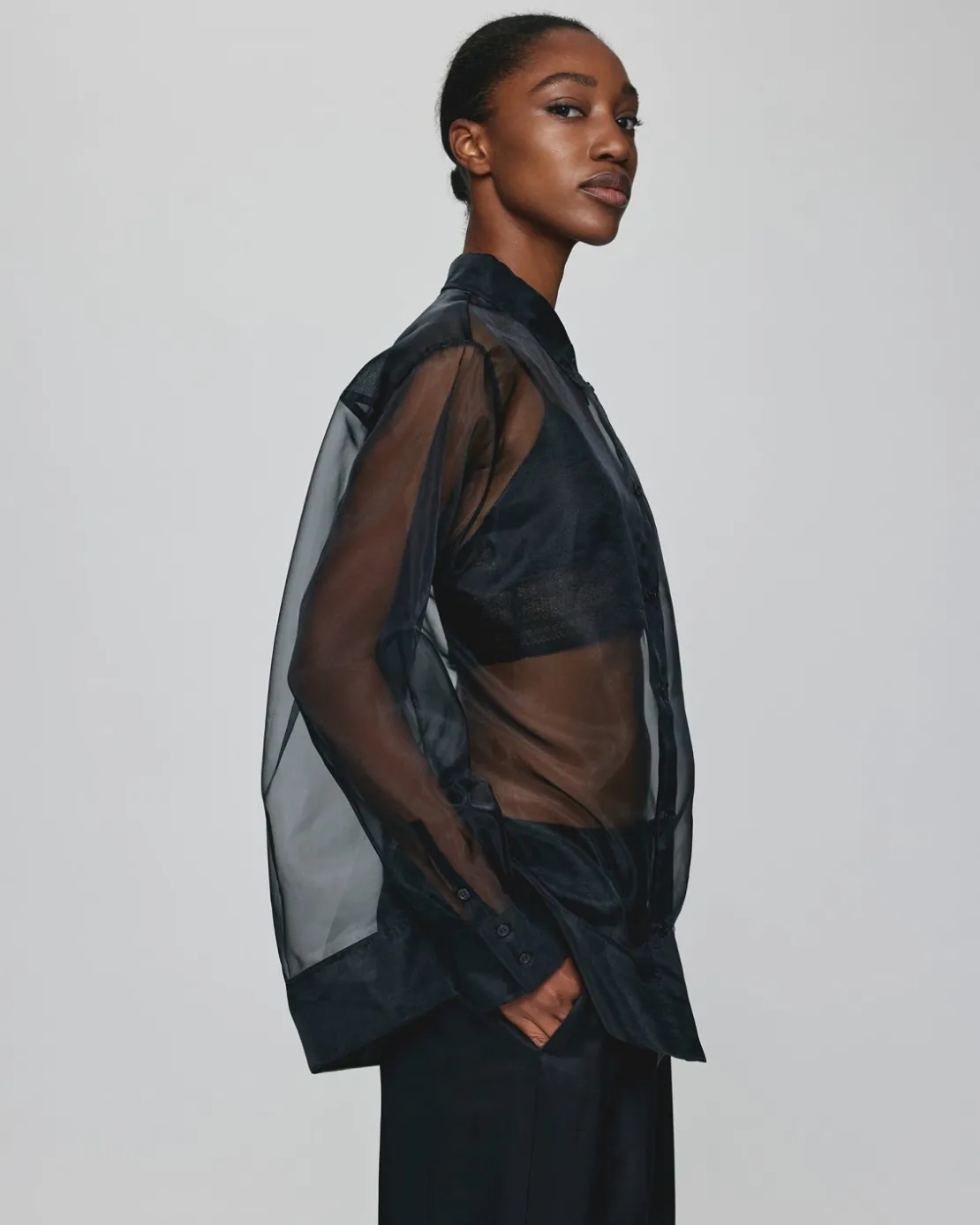 The Lita shirt is a combination of the classic, oversized shirt and a festive and feminine shirt. The shirt features a black collar, placket and cuffs while the rest of the shirt is in a sheer recycled polyester material.