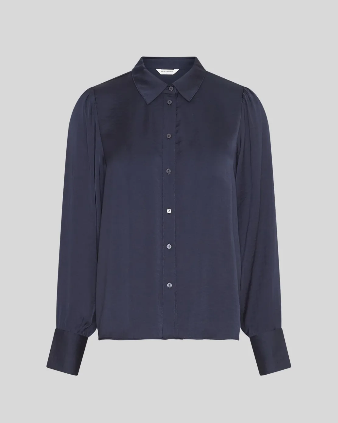 The Maluca shirt is a combination of classic and trendy with a touch of the pyjamas trend. It’s lightweight and flowy, with ballon sleeves, a classic collar and cuffs. The deep blue colour and the shiny look to the material makes it perfect for dressing up jeans, or used in a more formal occasion.