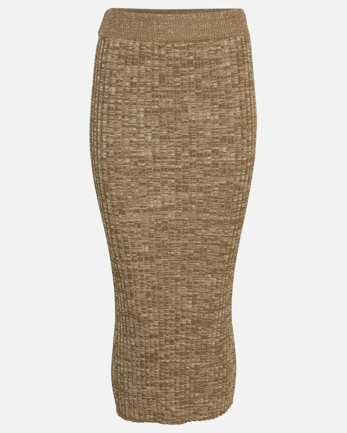 This knit skirt is made with a special space dye effect in a soft rib knit material. It features a high wasit and elastic waistline, which visually elongates your figure and make for gorgoues legs. This body-hugging silhouette highlights your curves at the right places and is perfect for any body. Style in a set, with matching Elleva pullover or a chic blouse for a more formal occasion.