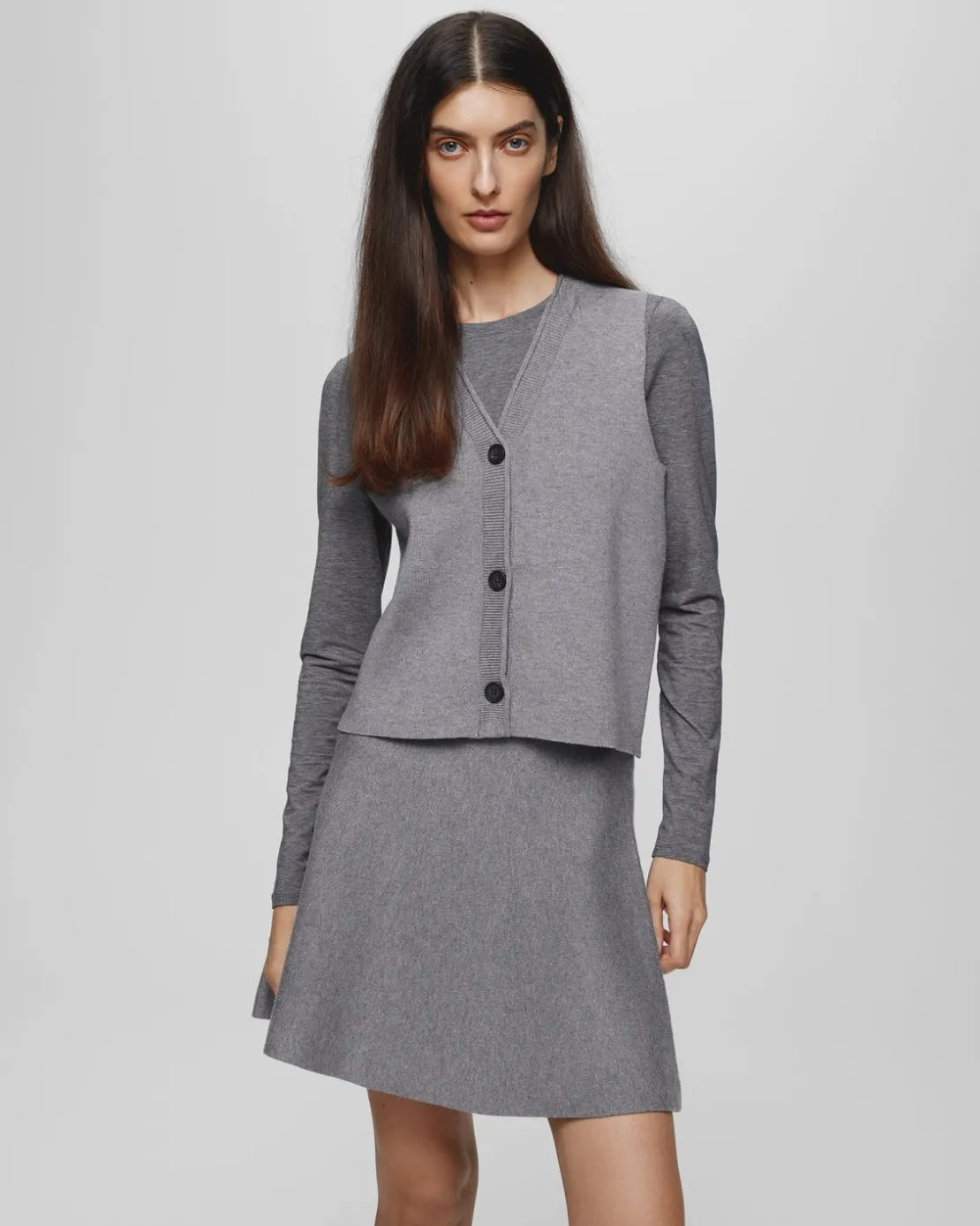 This short skirt is designed for ultimate comfort with its elastic waist, providing a secure fit and an easy way to hop in it. The A-shape adds a touch of volume and elegance, and flatters all body types, making it a versatile piece for various occasions. The full needle structure of the skirt does not only adds texture but also provides a sophisticated look. This timeless short skirt is a foundation piece to every feminine outfit, whether paired with a basic tee, or a classy rollneck.