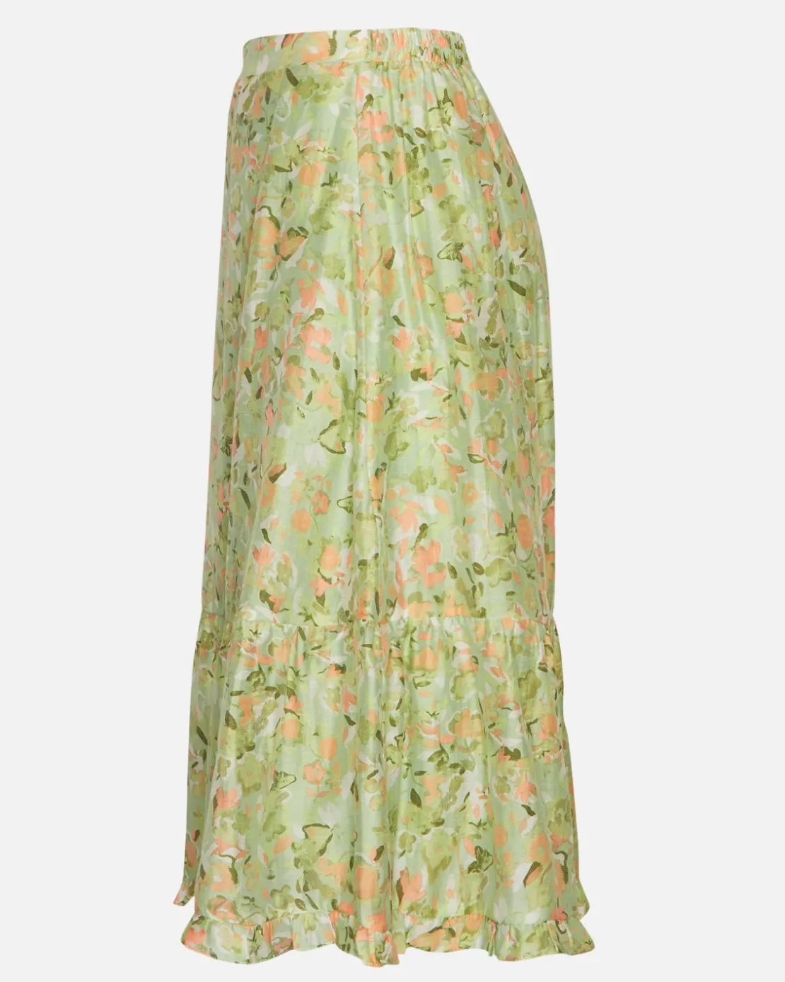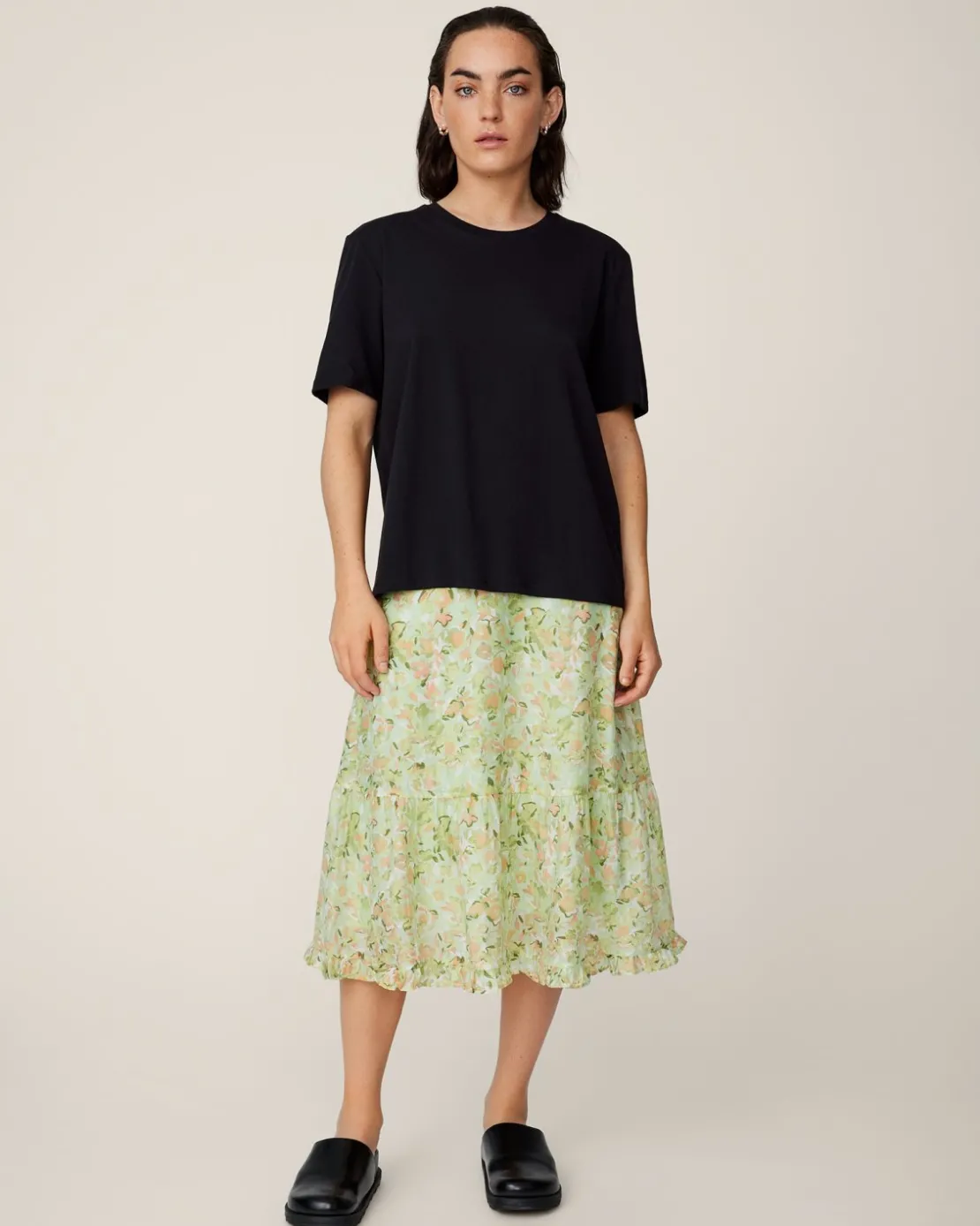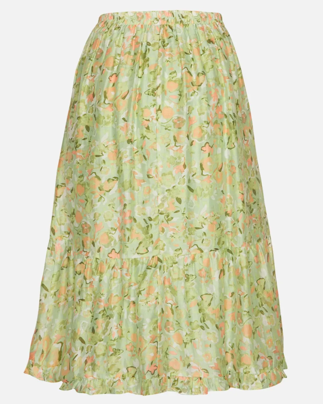 Slip into this floral skirt for an easy breey look. This mid-length skirt features peplum details and frills for a flouncy summer silhouette. It’s easy to wear as it has flat waistband on front and elastic at the back. Style it with a white linen blouse or a basic tee.