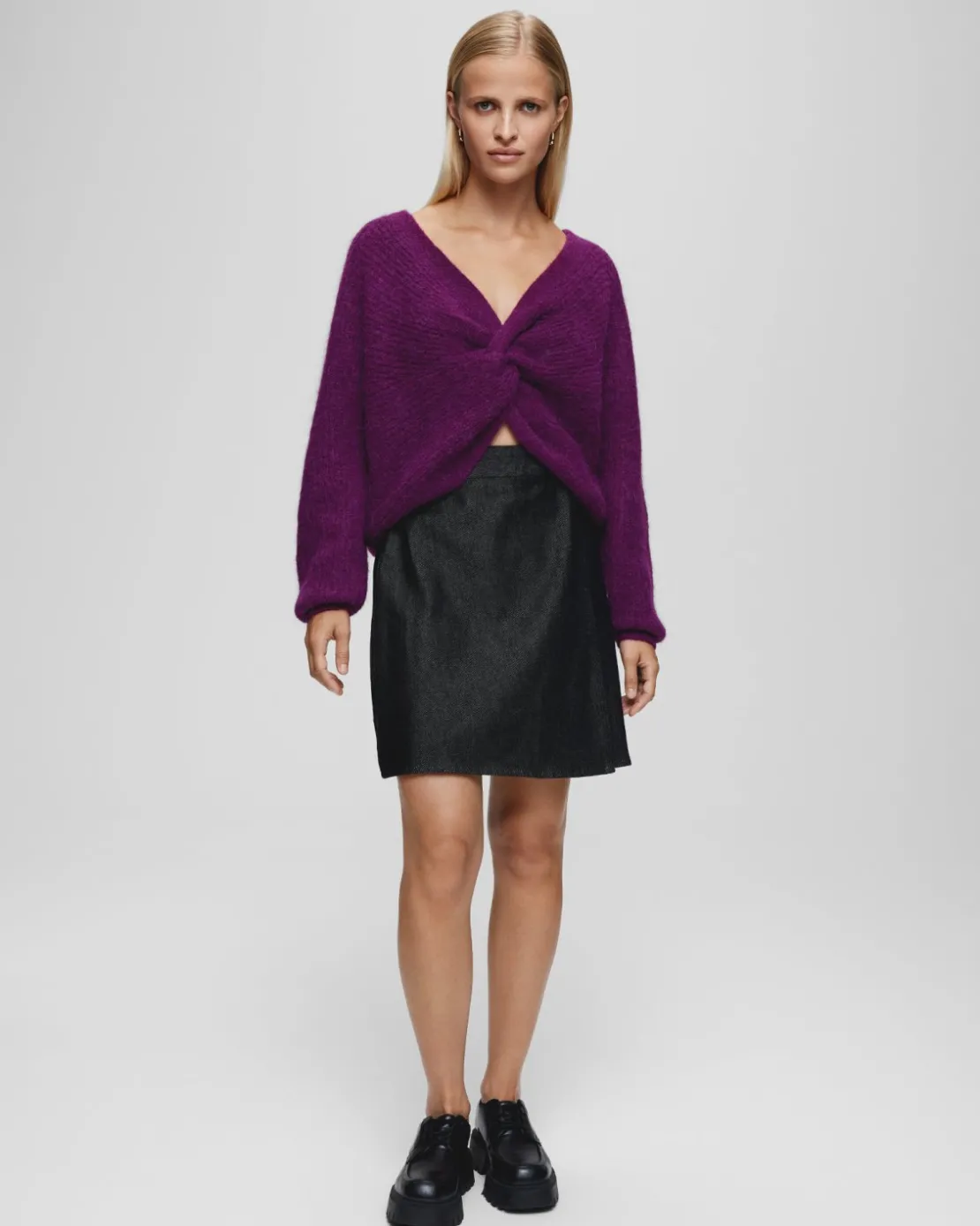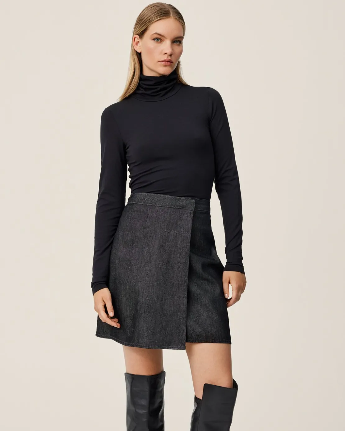 Elena is a soft denim quality, in a black washed colour. This skirt is a mini skirt, and features a wrap design, with a button closure. It’s edgy and cool. Style it with the matching denim jacket and a pair of high boots.