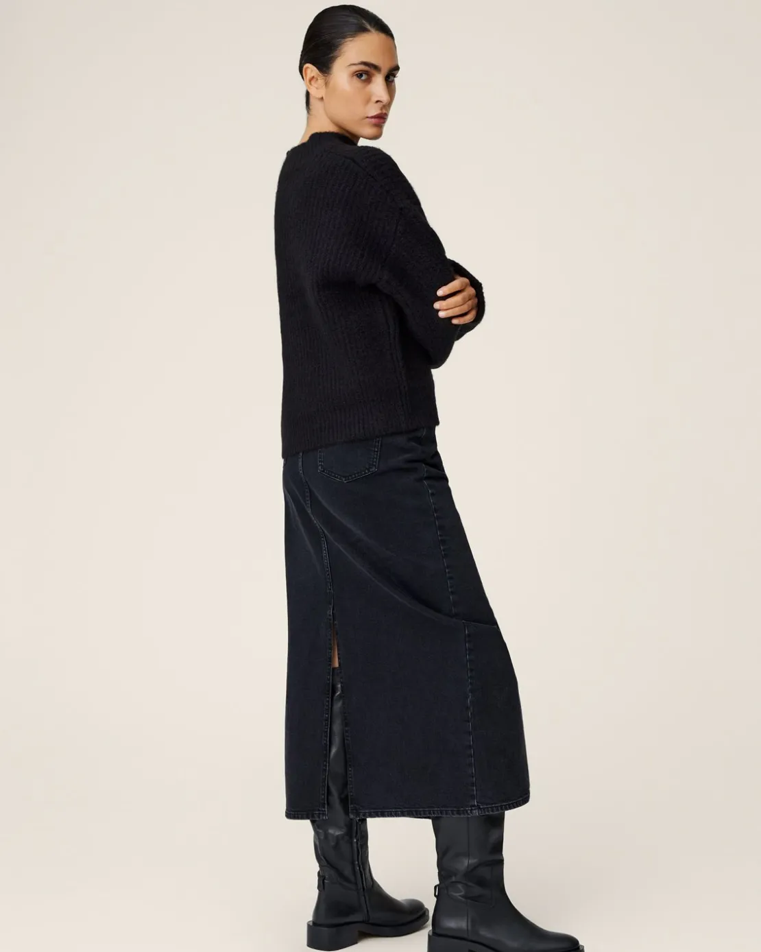 This skirt is a modern interpretation of classic denim, elongating the silhouette and adding a touch of edgy elegance.The length of the skirt is designed to fall gracefully below the knee, and with both a front and back slit to ensure there’s room for movement. Style it up for a fancy occasion og wear it as an everyday outfit with T-shirt, a knit and sneakers.